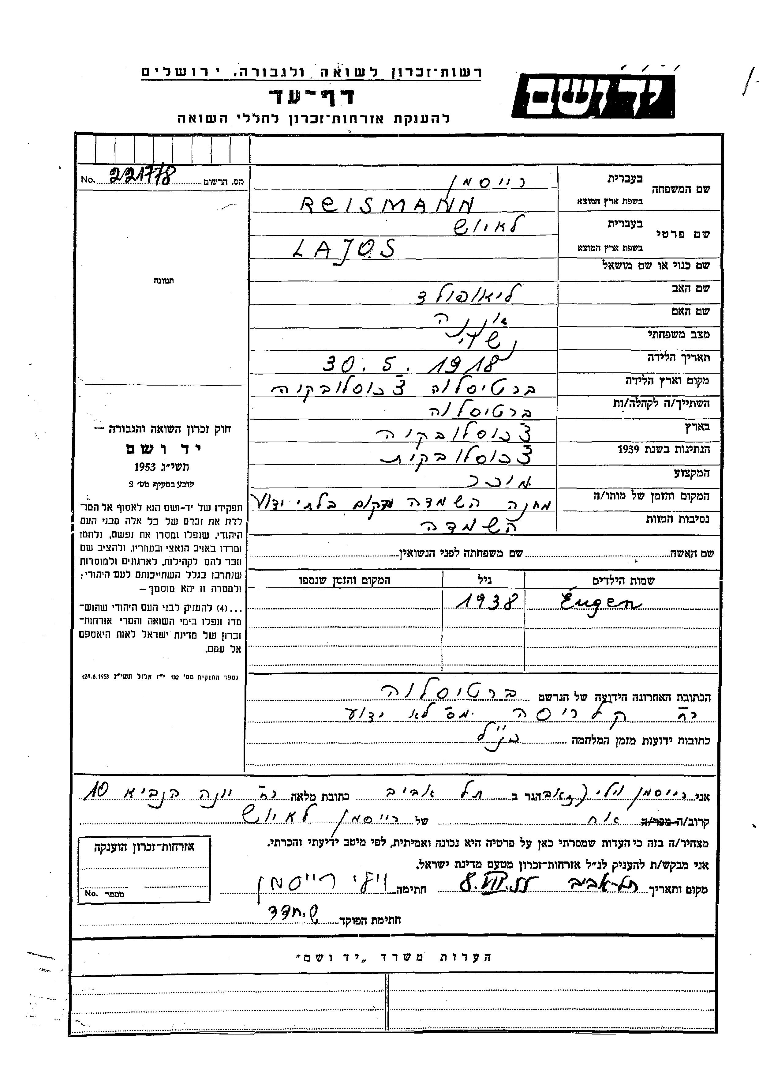 Eugen Reismann wurde im Jahr 1938 geboren. Er war der Sohn von Lajos. Er war Kind. Vor dem Zweiten Weltkrieg lebte er in Bratislava, Tschechoslowakei. Während des Krieges war er in Bratislava, Tschechoslowakei.