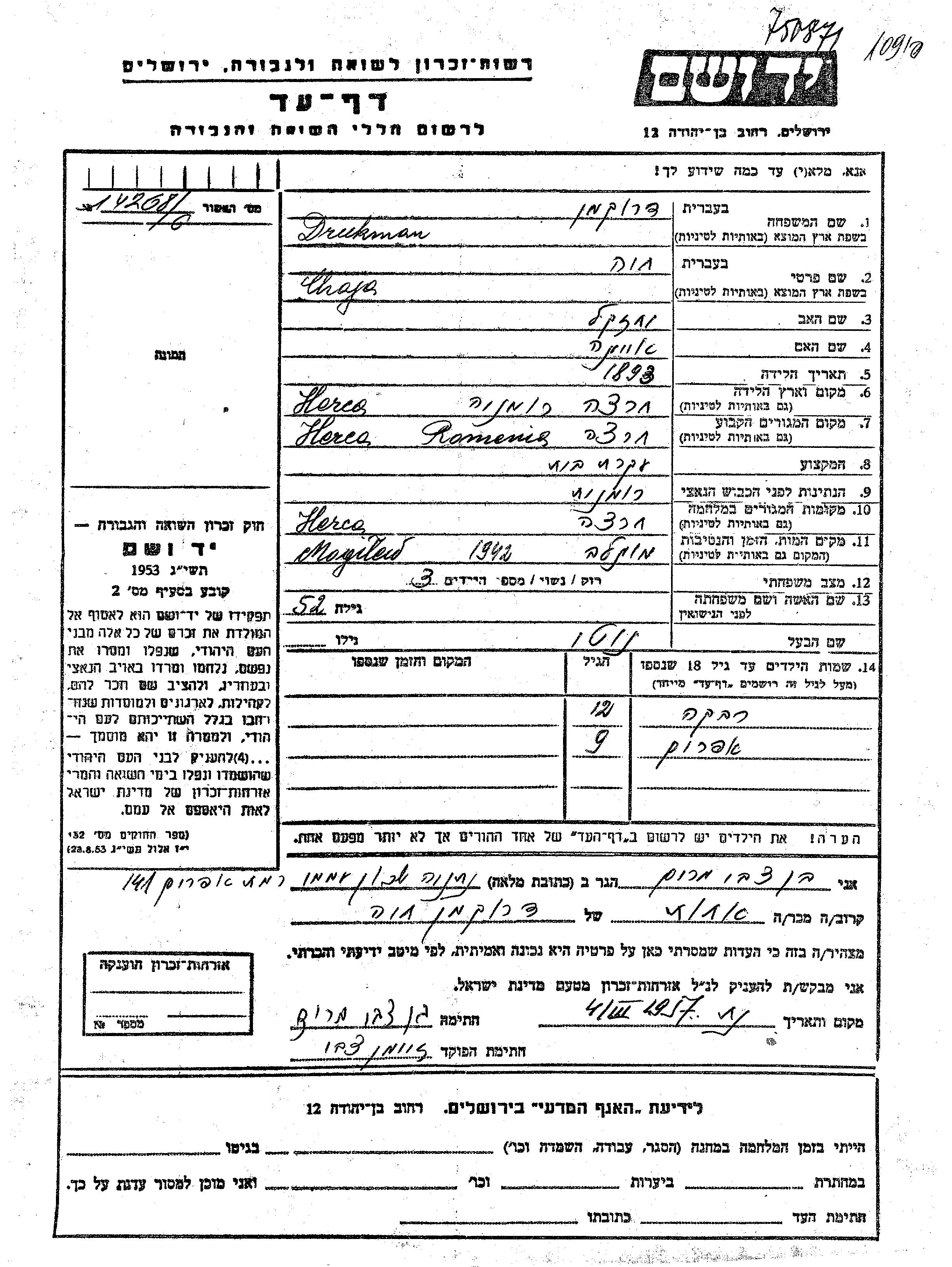 Rivka Drukman wurde Sie war die Tochter von Natan und Chaja. Sie war Kind. Vor dem Zweiten Weltkrieg lebte sie in Herca, Rumänien. Während des Krieges war sie in Herca, Rumänien.