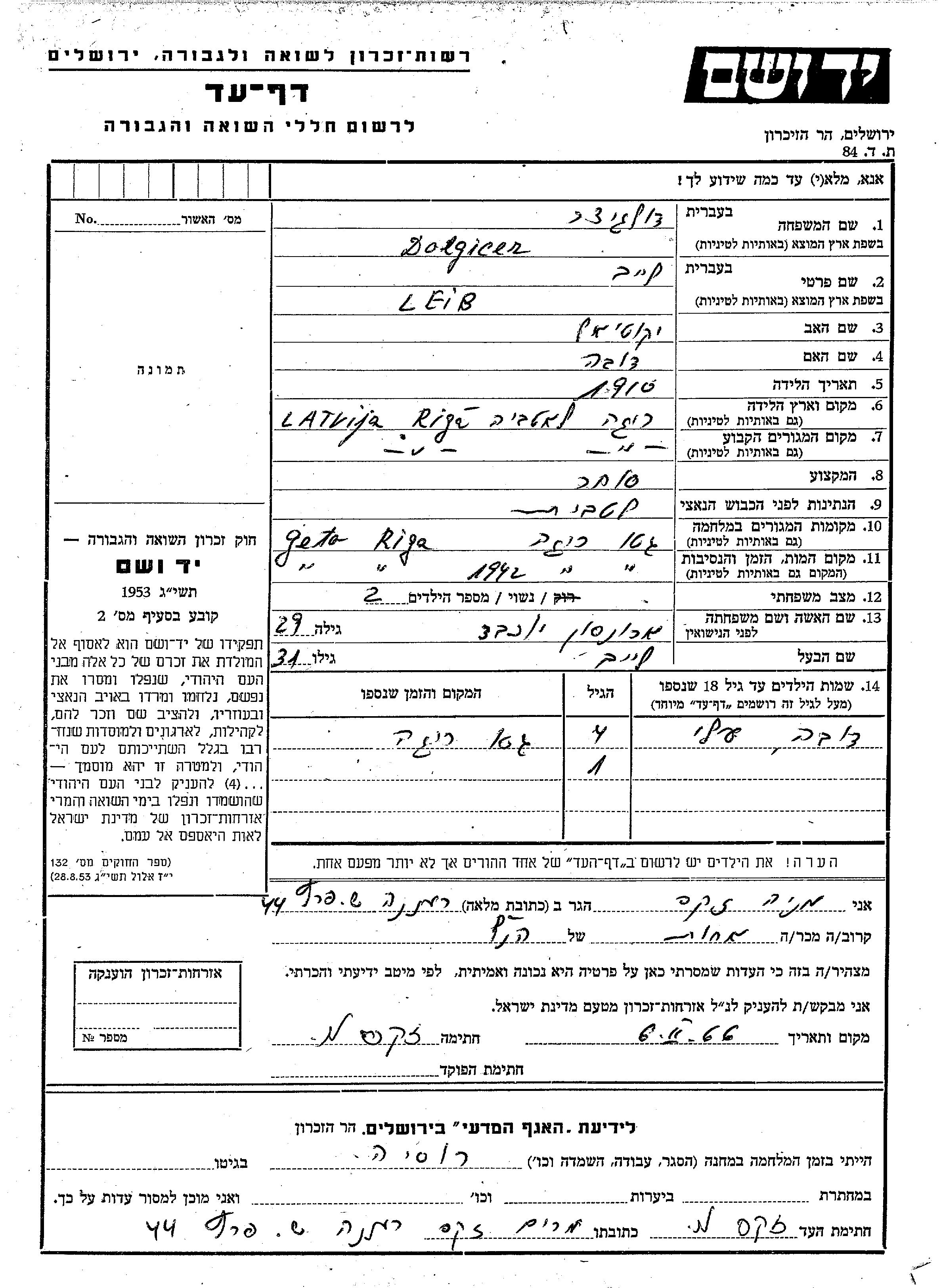 Doba Dolgicer wurde Er/sie war der/ die Sohn/Tochter von Leib und Yokheved, geb. Aronson. Er/Sie war Kind. Vor dem Zweiten Weltkrieg er/sie in Riga, Lettland. Während des Krieges war er/sie in Riga, Lettland.