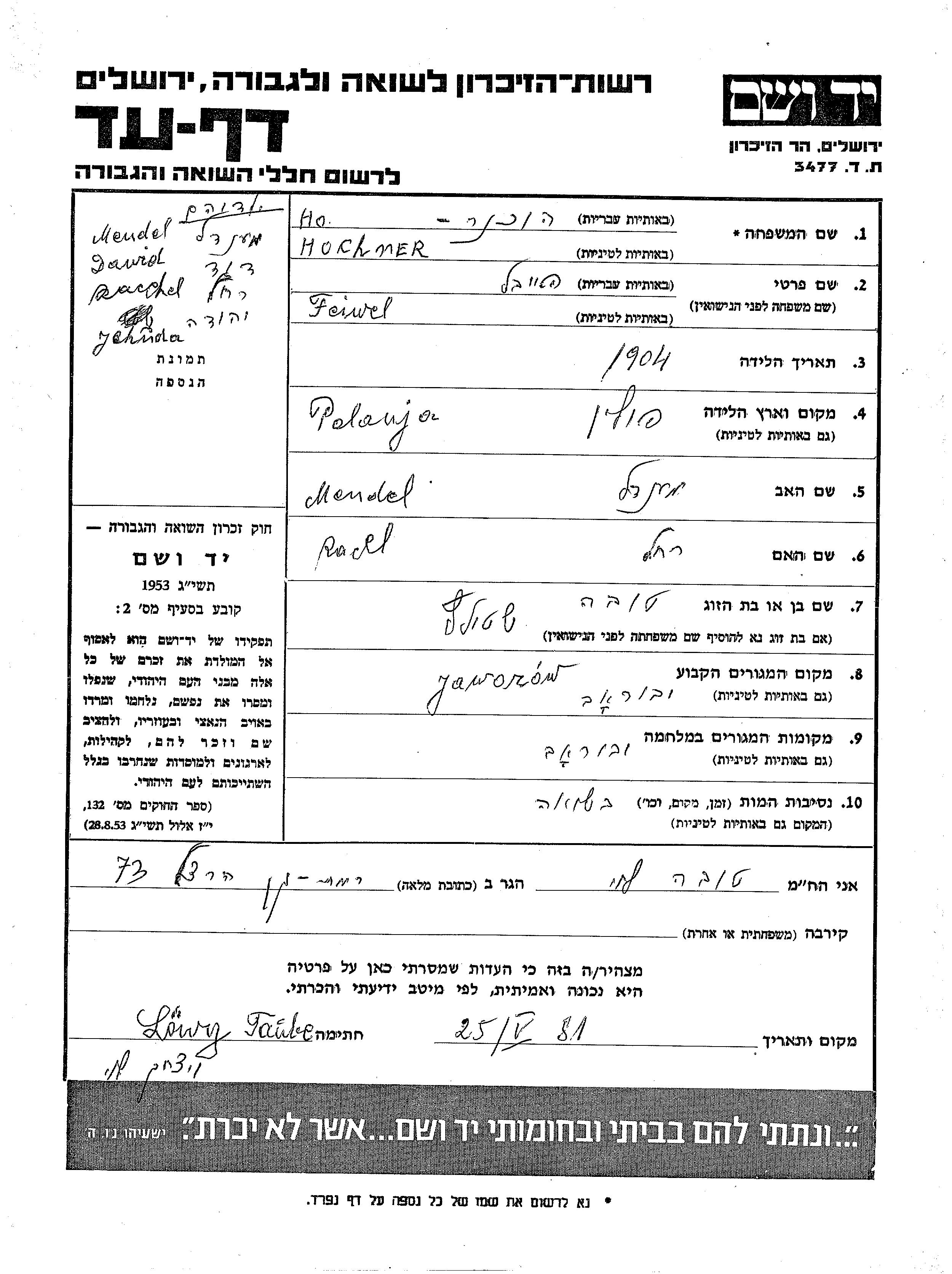 Jehuda Hokhner wurde Er war der Sohn von Feiwel und Tova, geb. Shtoltz. Er war Kind. Vor dem Zweiten Weltkrieg lebte er in Jaworow, Polen. Während des Krieges war er in Jaworow, Polen.