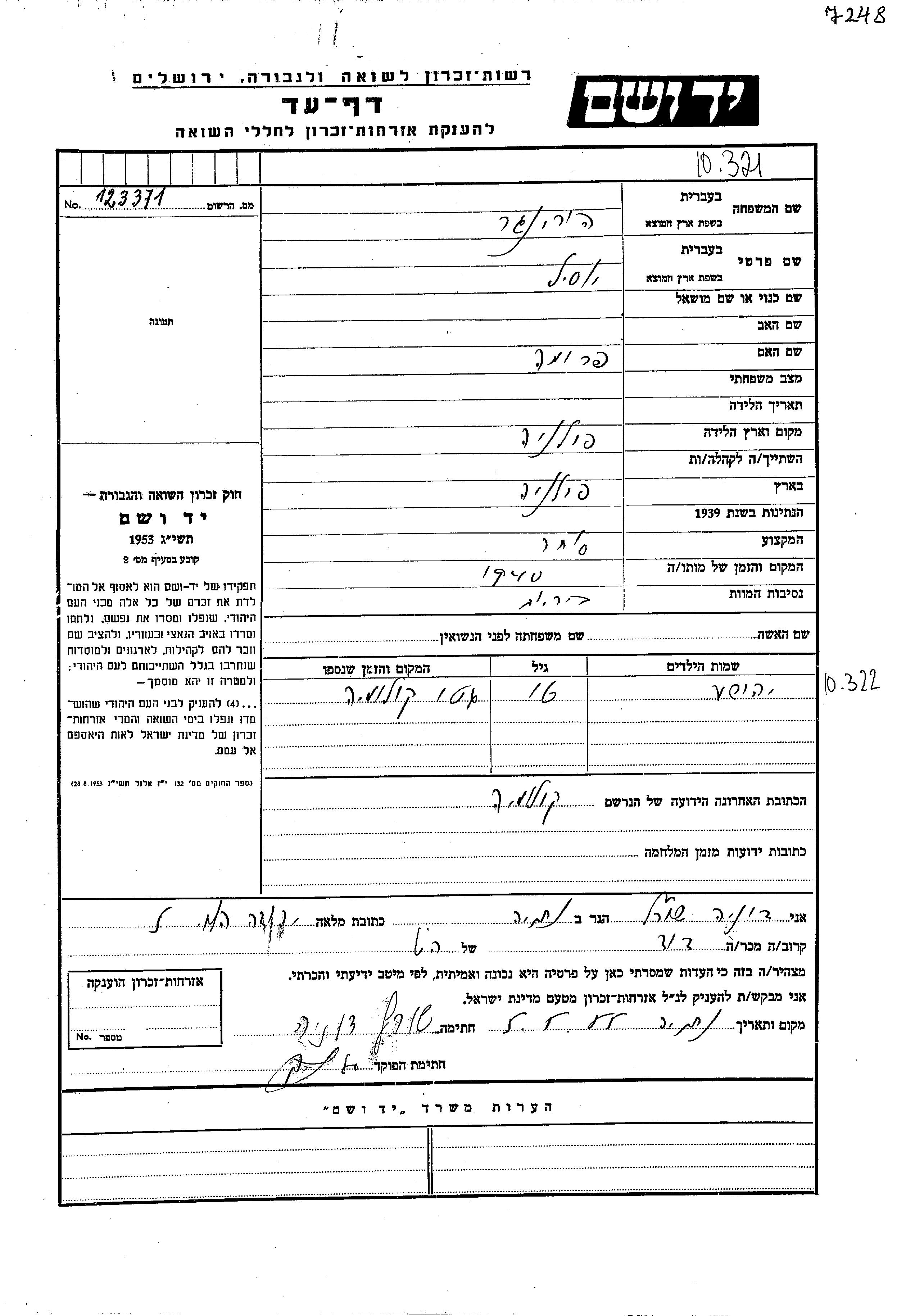 Yehoshua Horinger wurde Er war der Sohn von Yosef. Er war Kind. Vor dem Zweiten Weltkrieg lebte er in Kolomyja, Polen. Während des Krieges war er in Kolomyja, Polen.