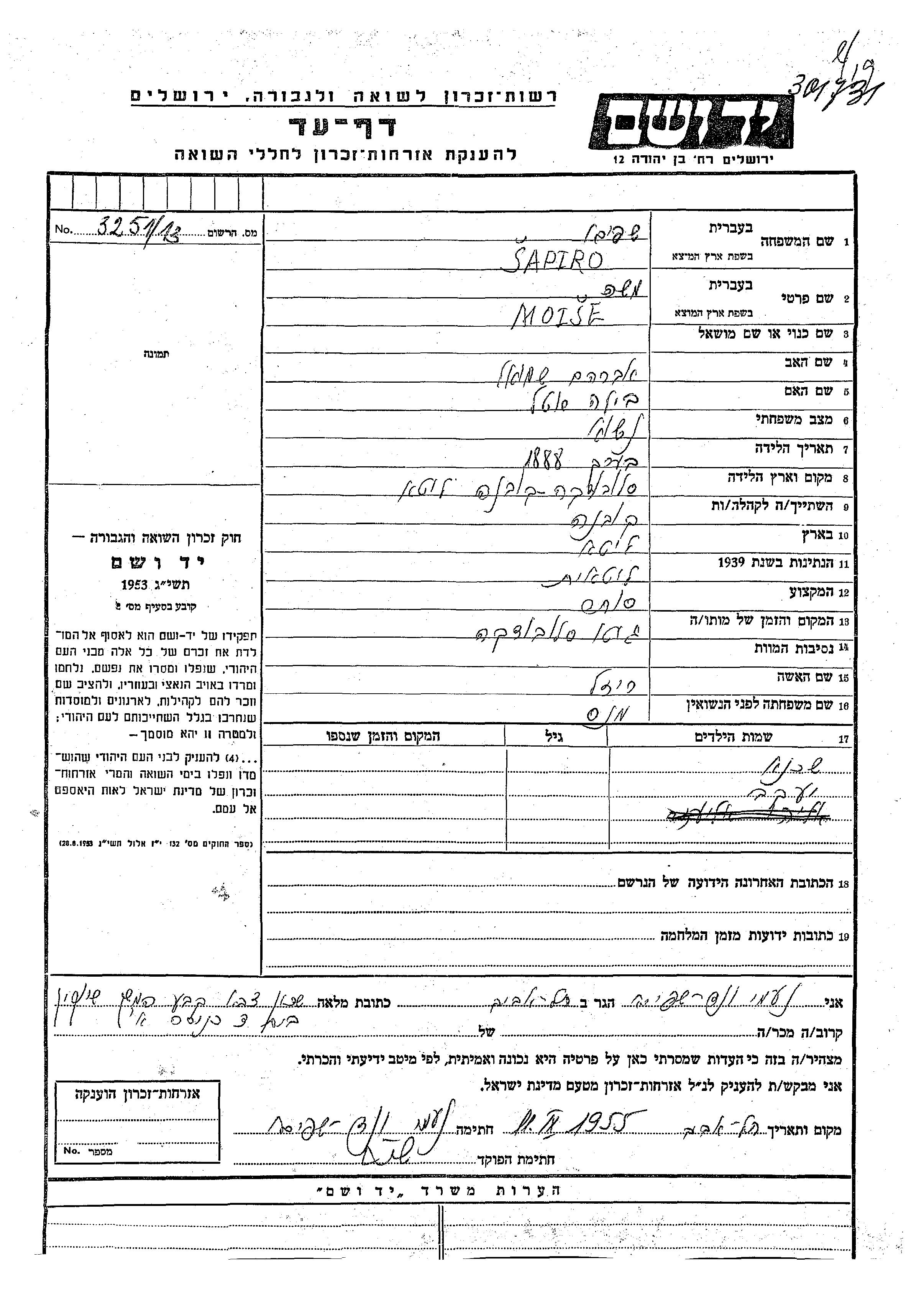 Shakhna Sapiro wurde Er/sie war der/ die Sohn/Tochter von Moise und Reizel, geb. Menes. Er/Sie war Kind.