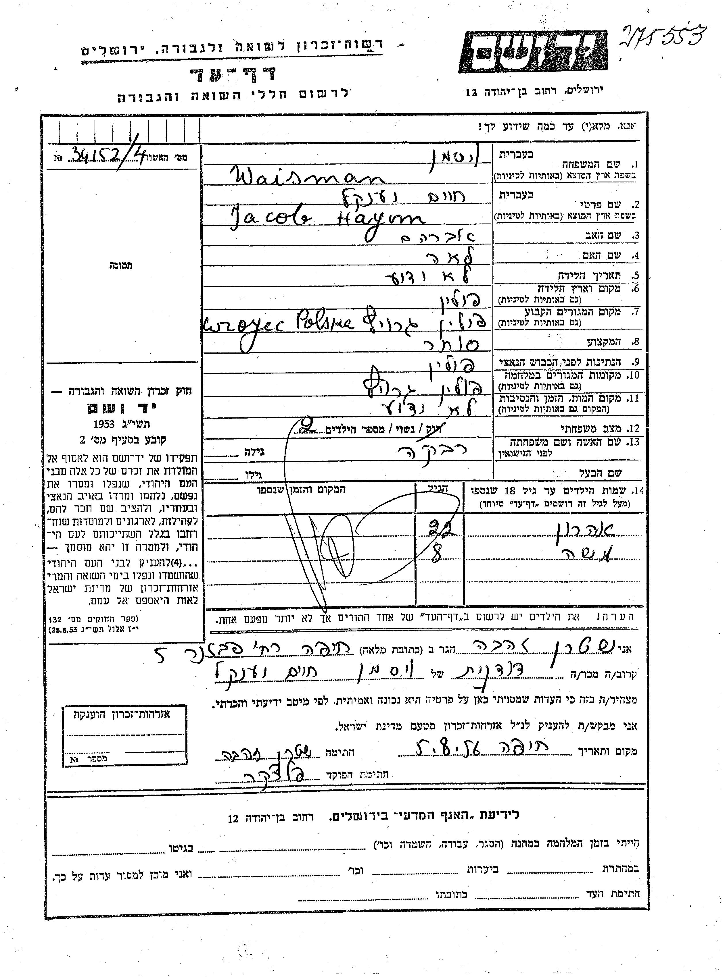 Moshe Waisman wurde Er war der Sohn von Jacob Hayim und Rivka. Er war Kind. Vor dem Zweiten Weltkrieg lebte er in Grojec, Polen. Während des Krieges war er in Grojec, Polen.