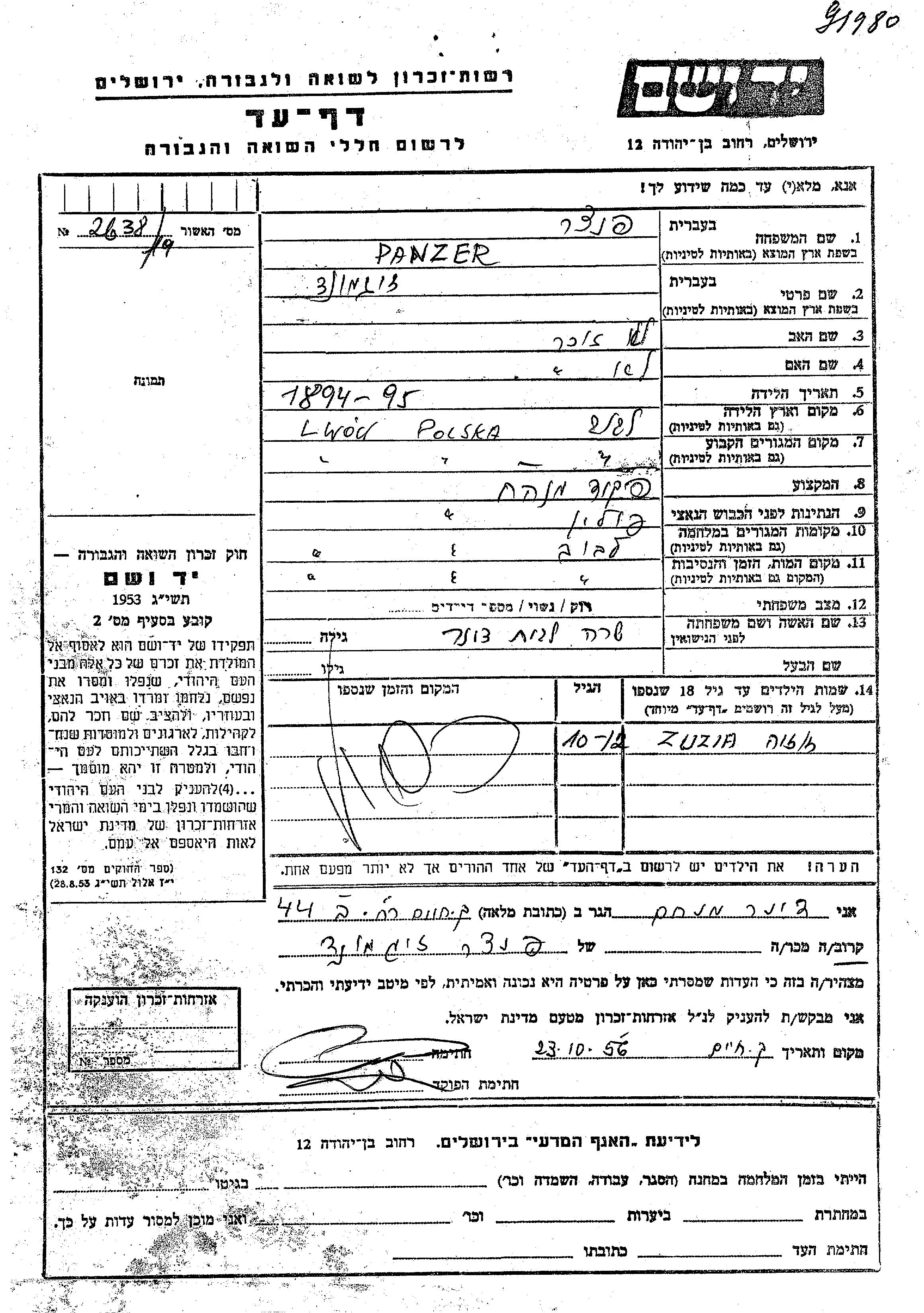 Zuzia Panzer Pantzer wurde Er/sie war der/ die Sohn/Tochter von Zigmund und Sara, geb. Diner. Er/Sie war Kind. Vor dem Zweiten Weltkrieg er/sie in Lwow, Polen. Während des Krieges war er/sie in Lwow, Polen.