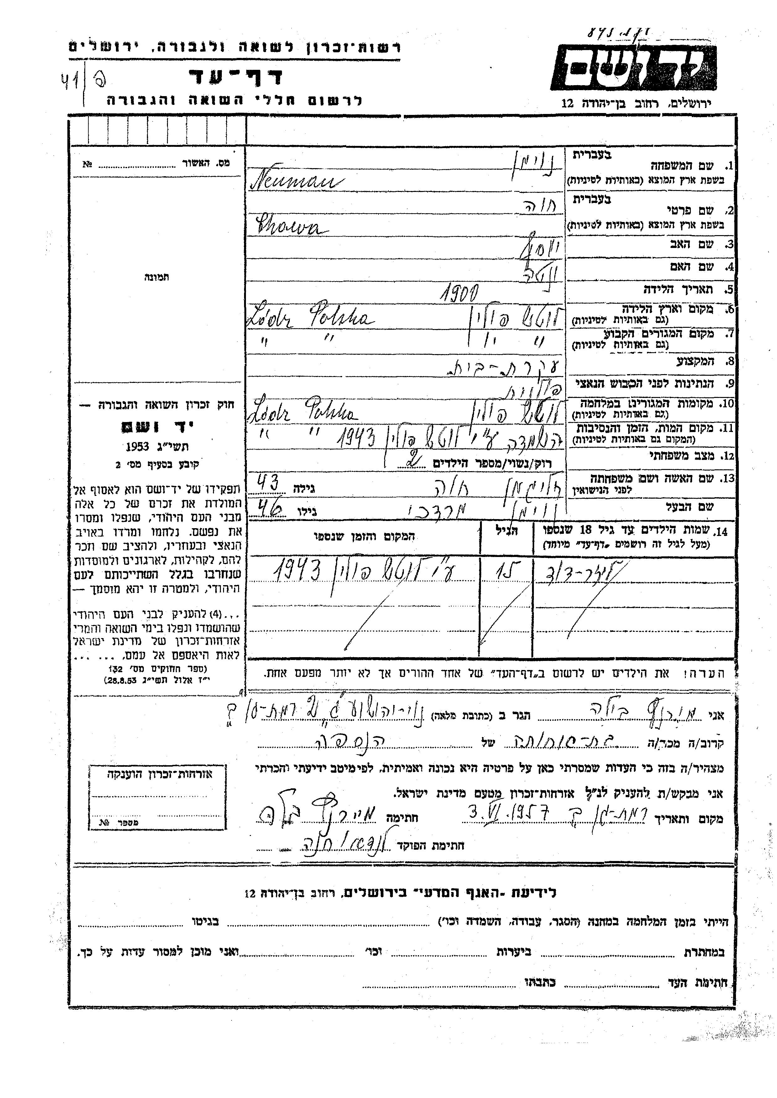 Eliezer David Neuman wurde Er war der Sohn von Mordekhai und Chawa, geb. Zeligman. Er war Kind. Vor dem Zweiten Weltkrieg lebte er in Lodz, Polen. Während des Krieges war er in Lodz, Polen.