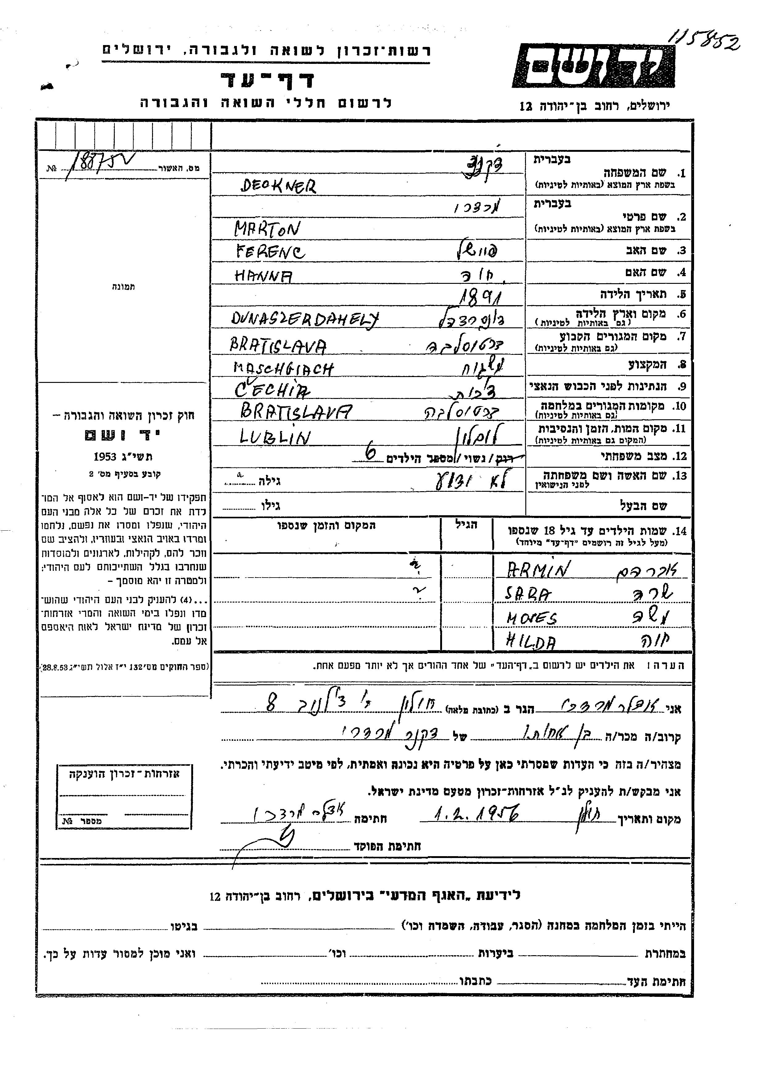 Armin Avraham Deokner wurde Er war der Sohn von Mordekhai Marton. Er war Kind. Vor dem Zweiten Weltkrieg lebte er in Bratislava, Tschechoslowakei. Während des Krieges war er in Bratislava, Tschechoslowakei.
