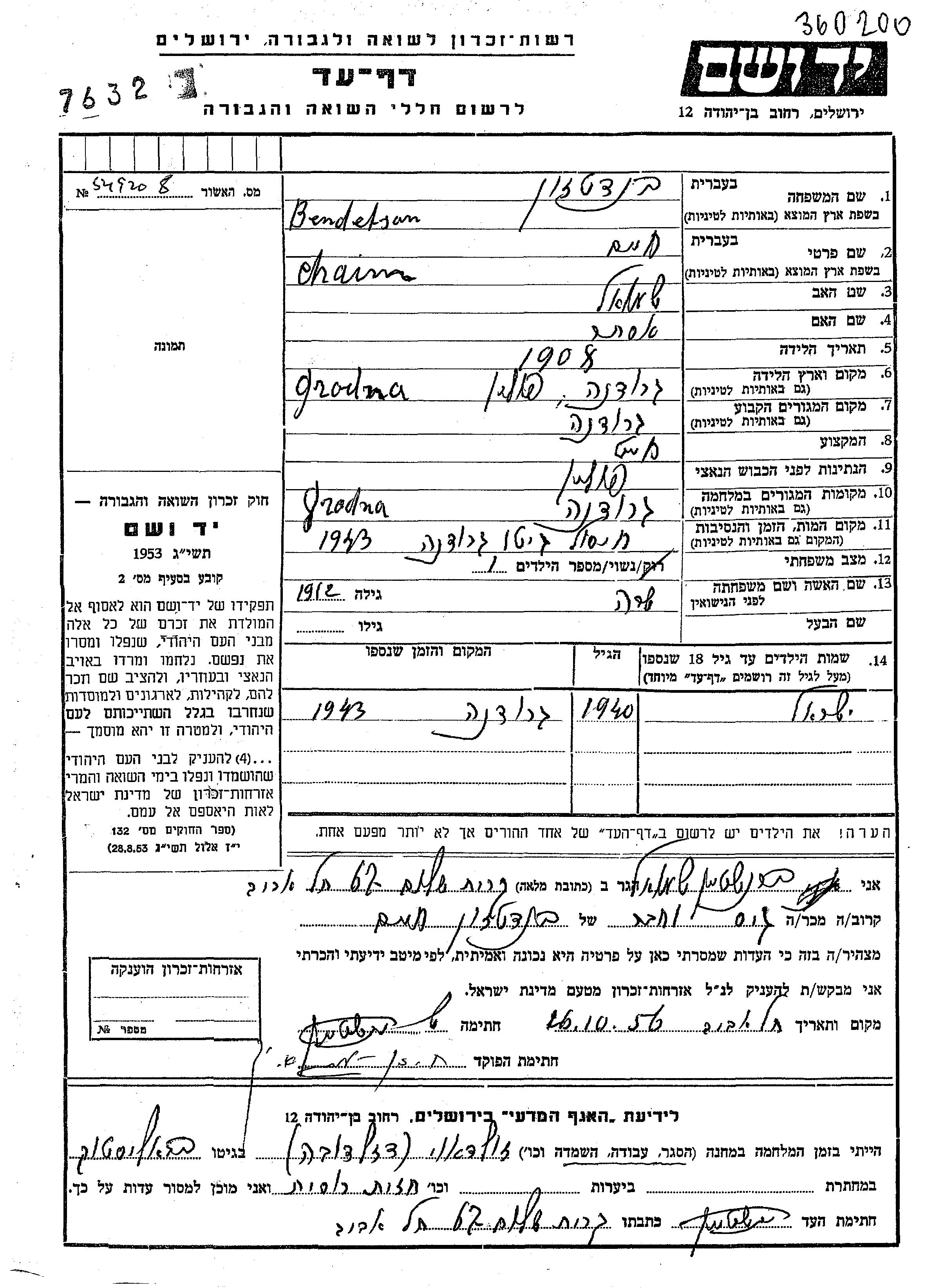 Bendetson Yisrael 1940 Grodno, Polen Gedenkblatt