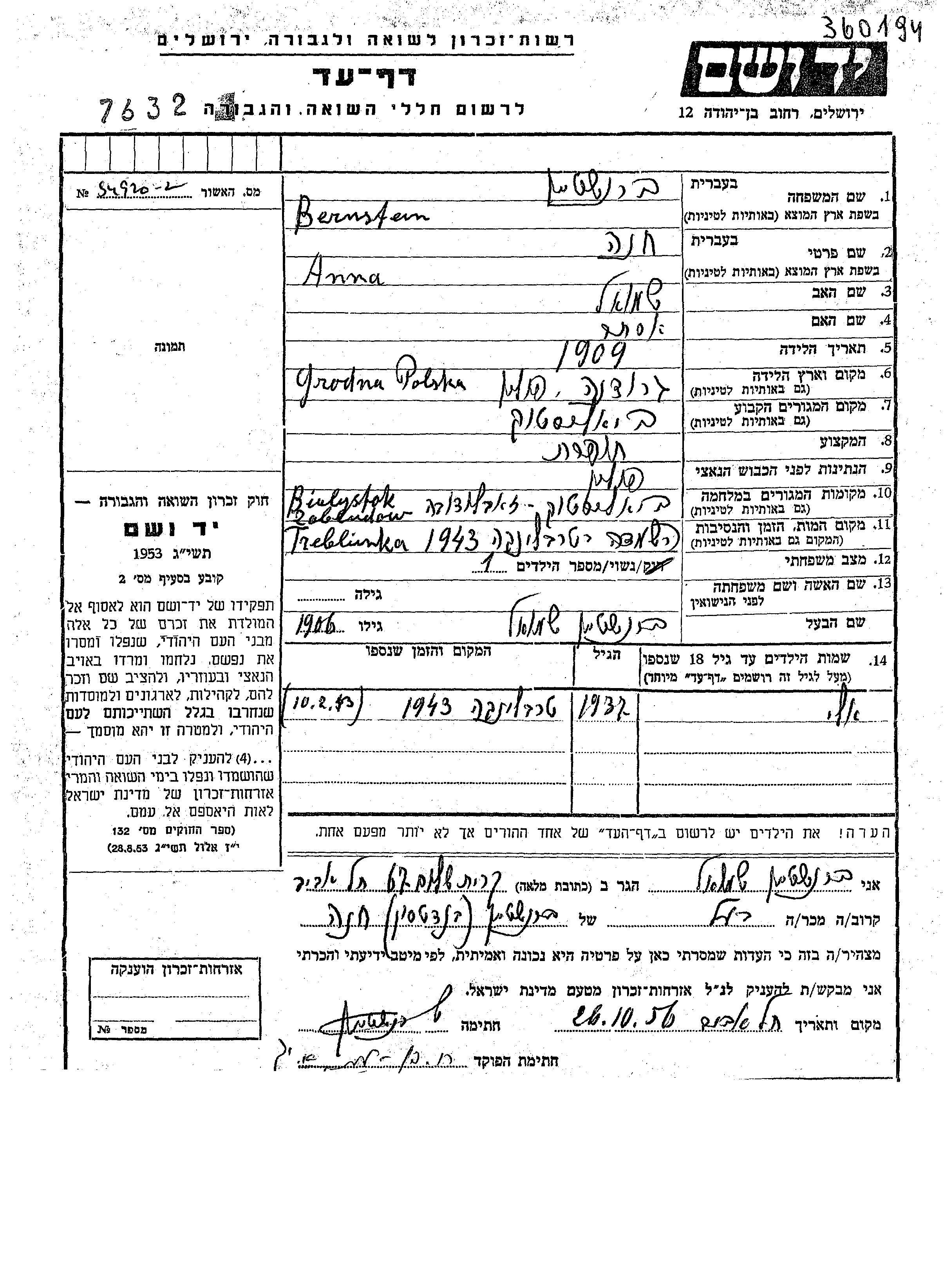 Eli Bernstein Branshtein wurde im Jahr 1937 geboren. Er/sie war der/ die Sohn/Tochter von Shmuel und Anna Khana, geb. Bendetson. Er/Sie war Kind. Vor dem Zweiten Weltkrieg er/sie in Bialistok, Polen. Während des Krieges war er/sie in Zabludow, Polen.