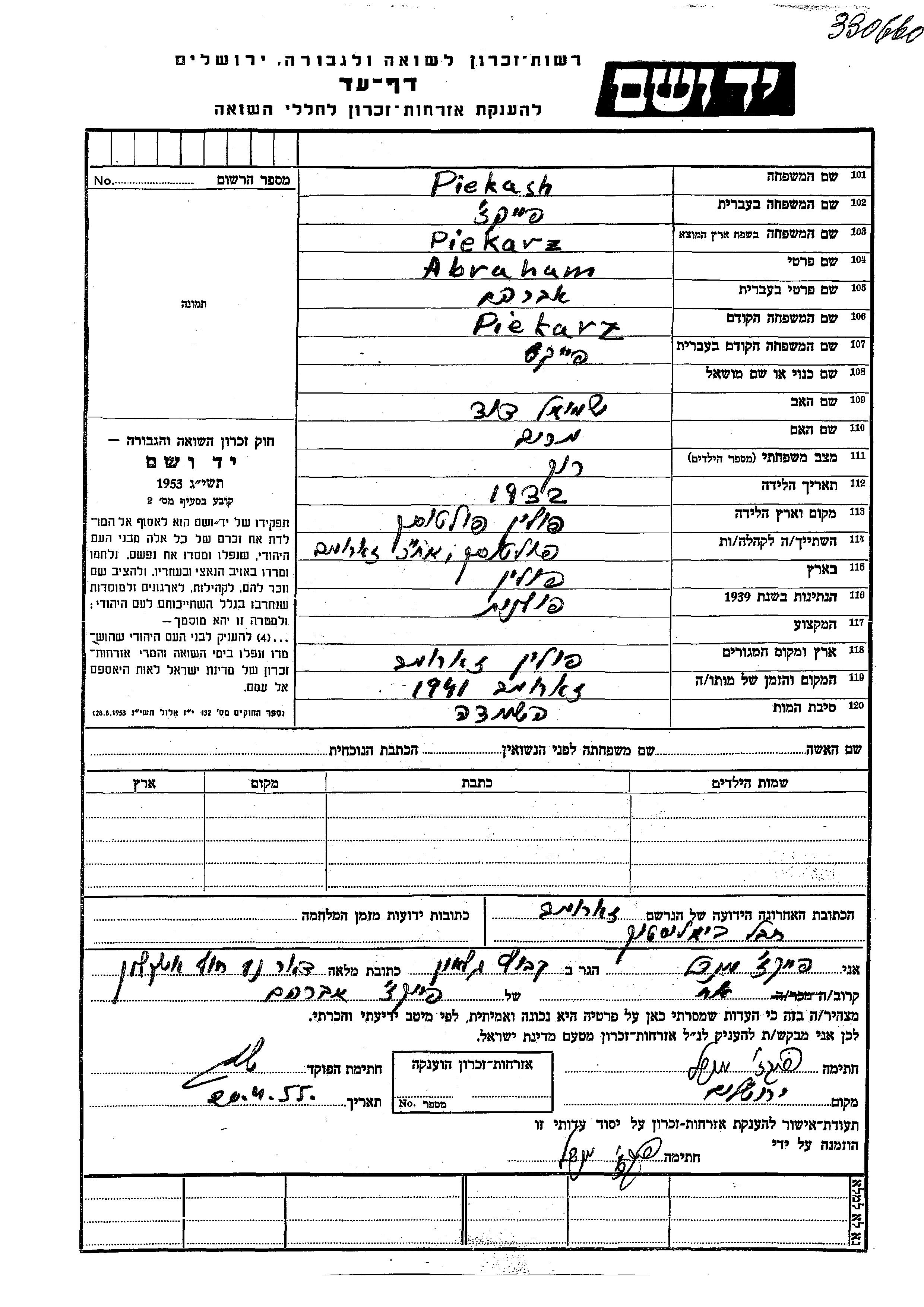 Abraham wurde in der Schoah ermordet. Todesort: Zaromb, Polen im Jahr 1941.