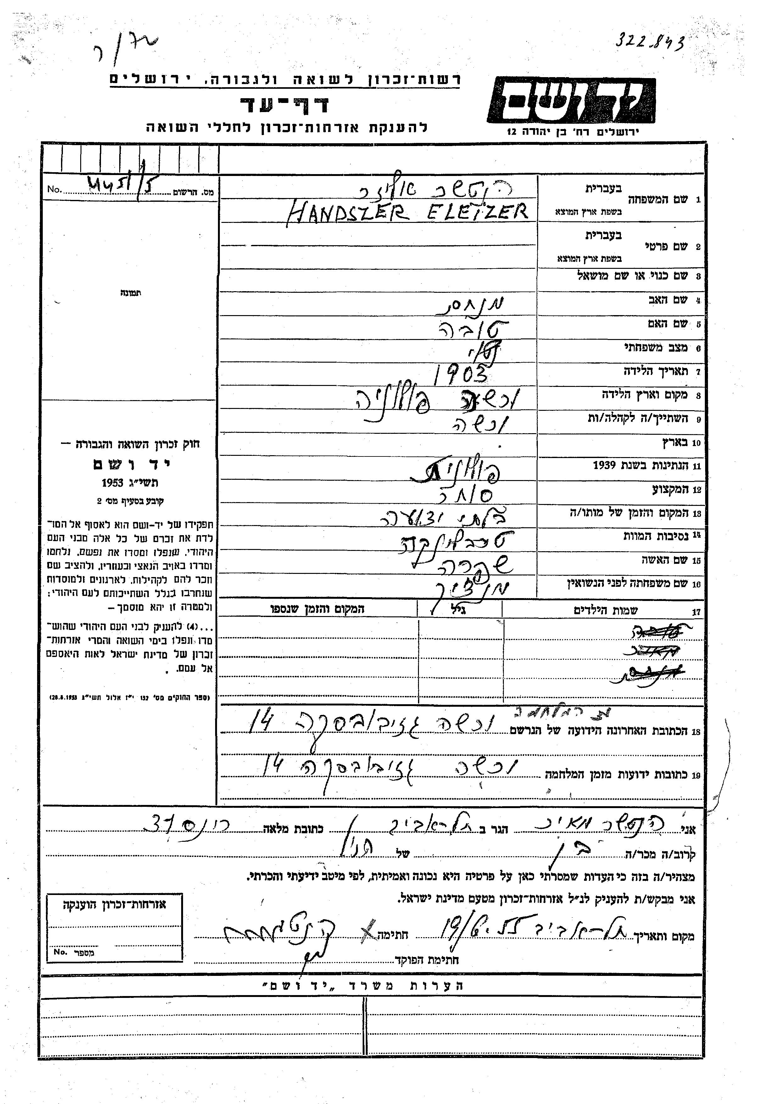 Meir Handszer wurde Er war der Sohn von Eleizer und Shifra, geb. Mantzik. Er war Kind. Vor dem Zweiten Weltkrieg lebte er in Warszawa, Polen. Während des Krieges war er in Warszawa, Polen.