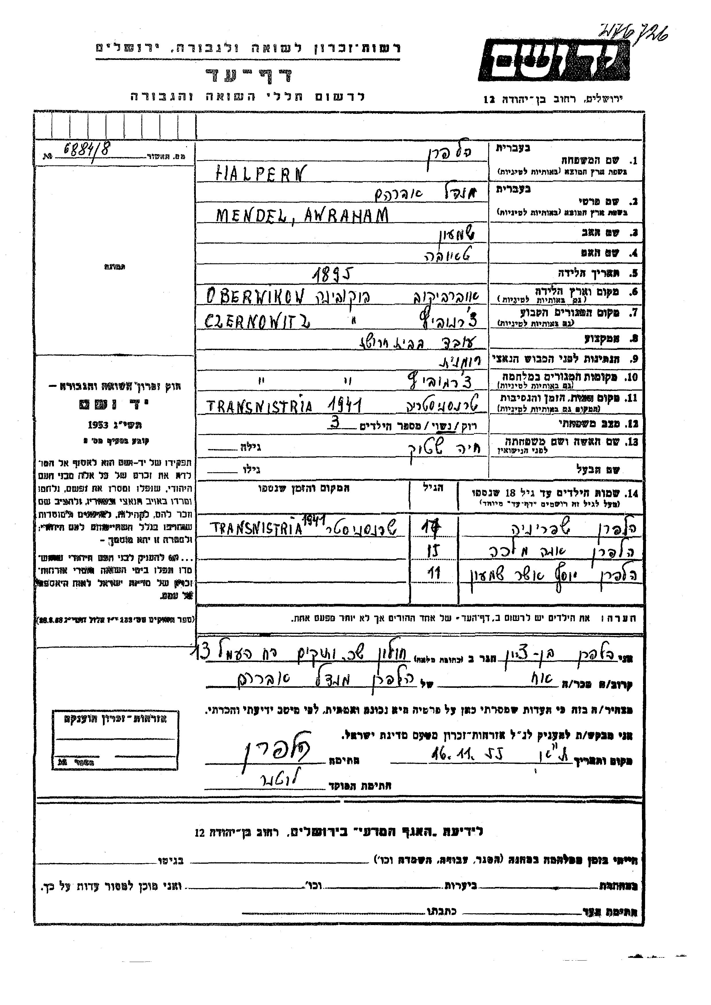 Ana Malka Halpern wurde Er/sie war der/ die Sohn/Tochter von Mendel Awraham und Khaia, geb. Shtok. Er/Sie war Kind. Vor dem Zweiten Weltkrieg er/sie in Czernowitz, Rumänien. Während des Krieges war er/sie in Czernowitz, Rumänien.