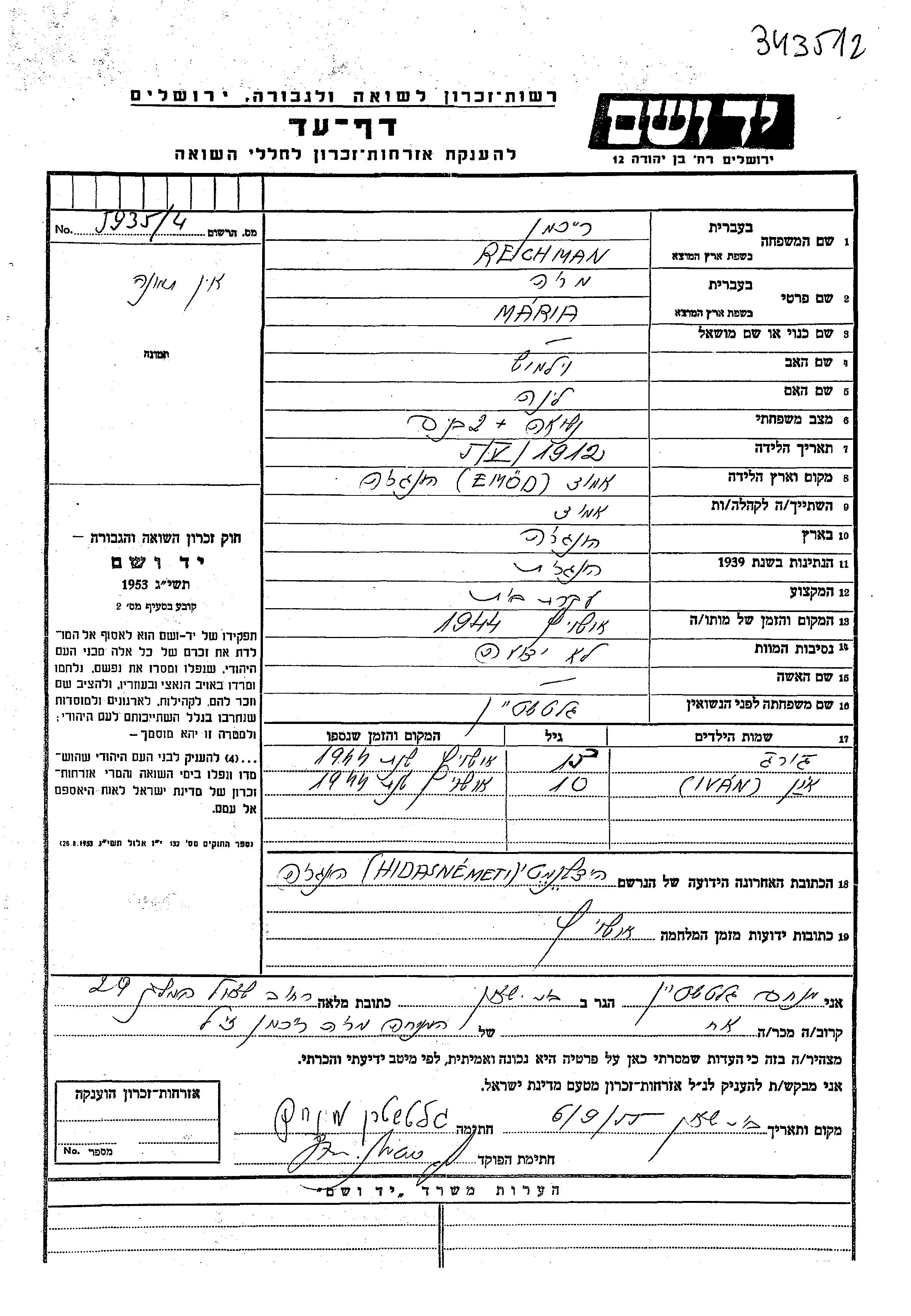 Dzhordzh Reichman wurde Er war der Sohn von Maria, geb. Glatshtein. Er war Kind. Vor dem Zweiten Weltkrieg lebte er in Emod, Ungarn. Während des Krieges war er in Auschwitz, Polen.