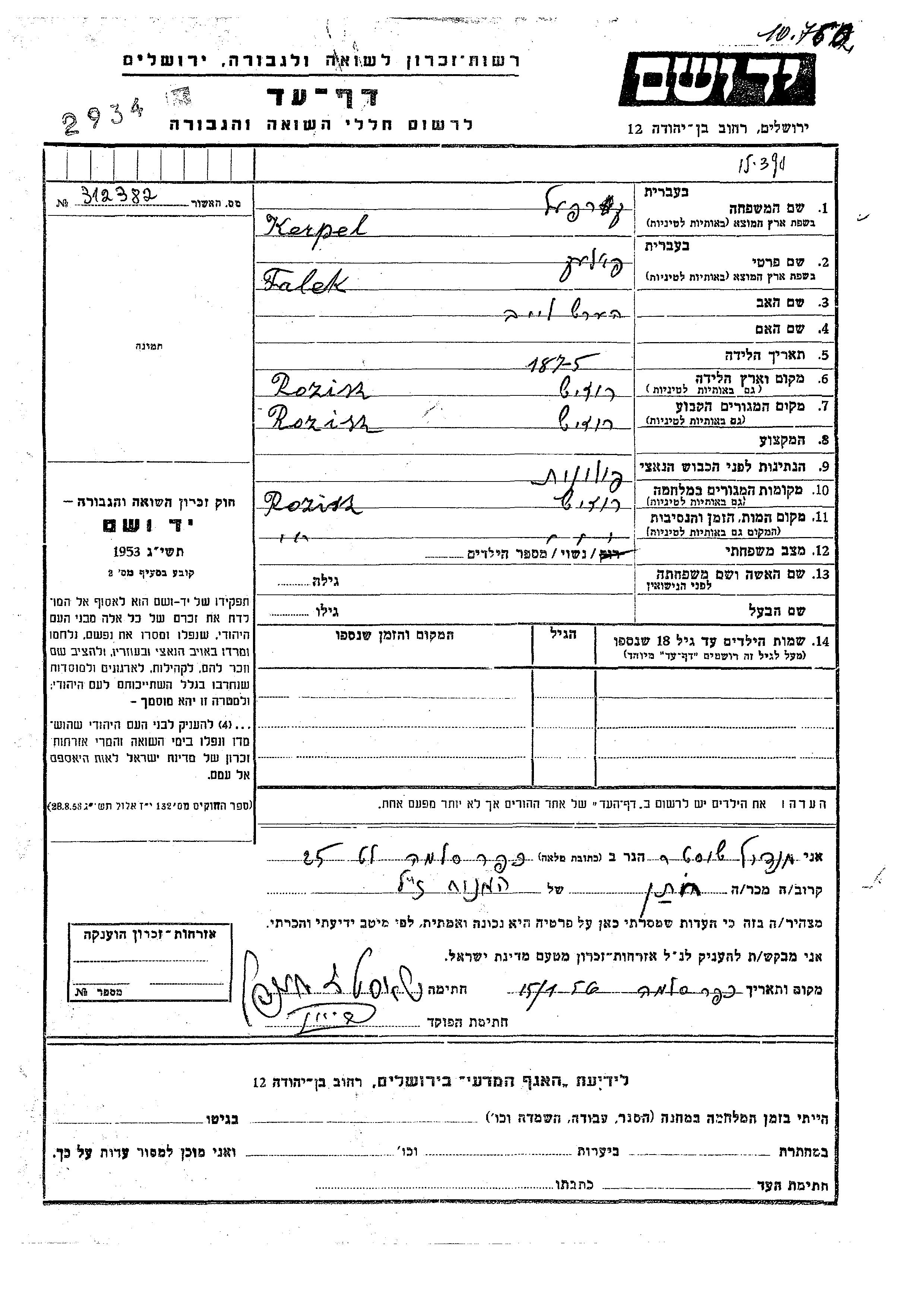 Falek Kerpel wurde im Jahr 1875 in Rozisce, Polen geboren. Er war der Sohn von Hersh Leib. Er war Verheiratet. Vor dem Zweiten Weltkrieg lebte er in Rozisce, Polen. Während des Krieges war er in Rozisce, Polen.