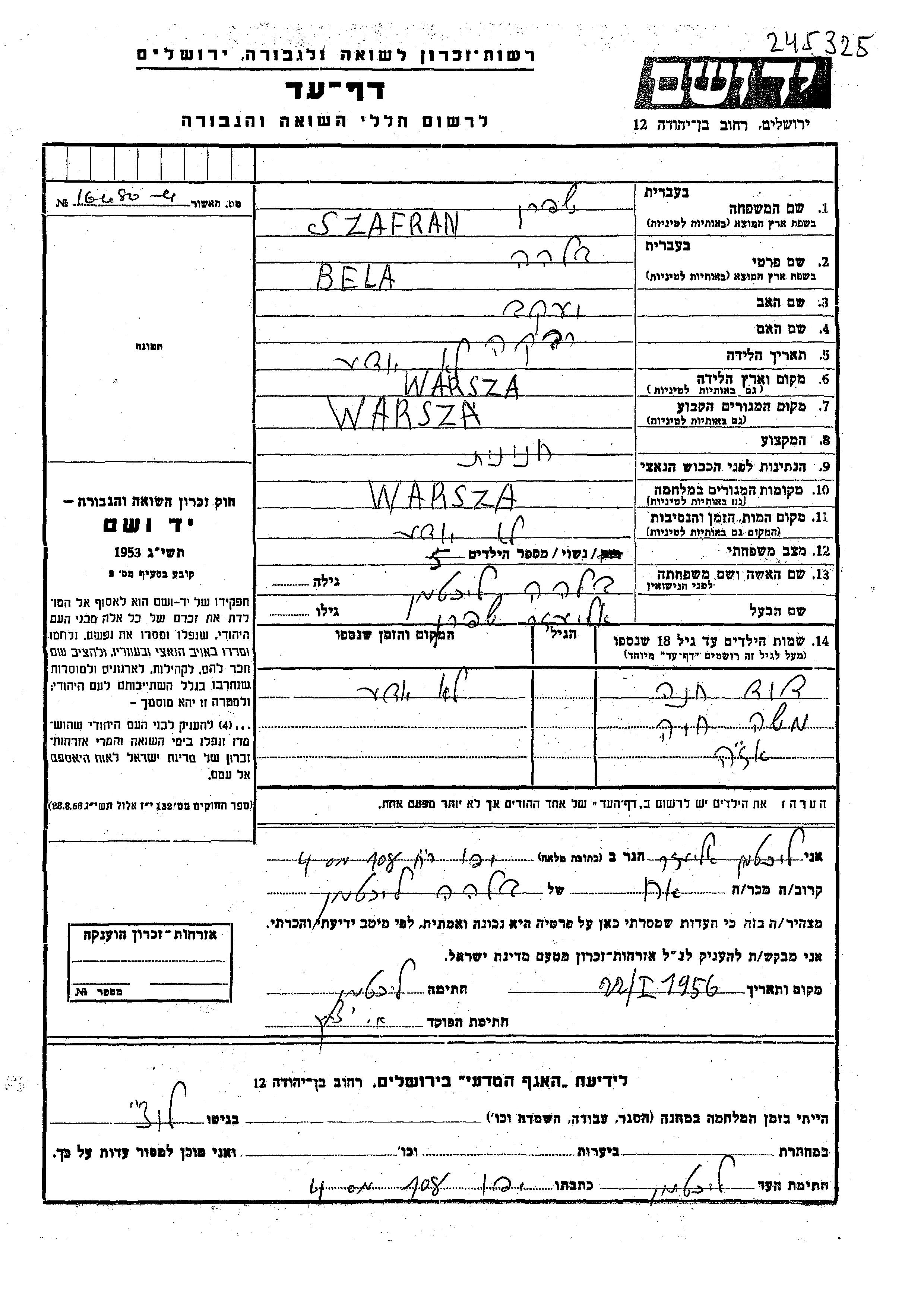 David Szafran wurde Er war der Sohn von Eliezer und Bela Bilha, geb. Likhtman. Er war Kind. Vor dem Zweiten Weltkrieg lebte er in Warsaw, Polen. Während des Krieges war er in Warsaw, Polen.