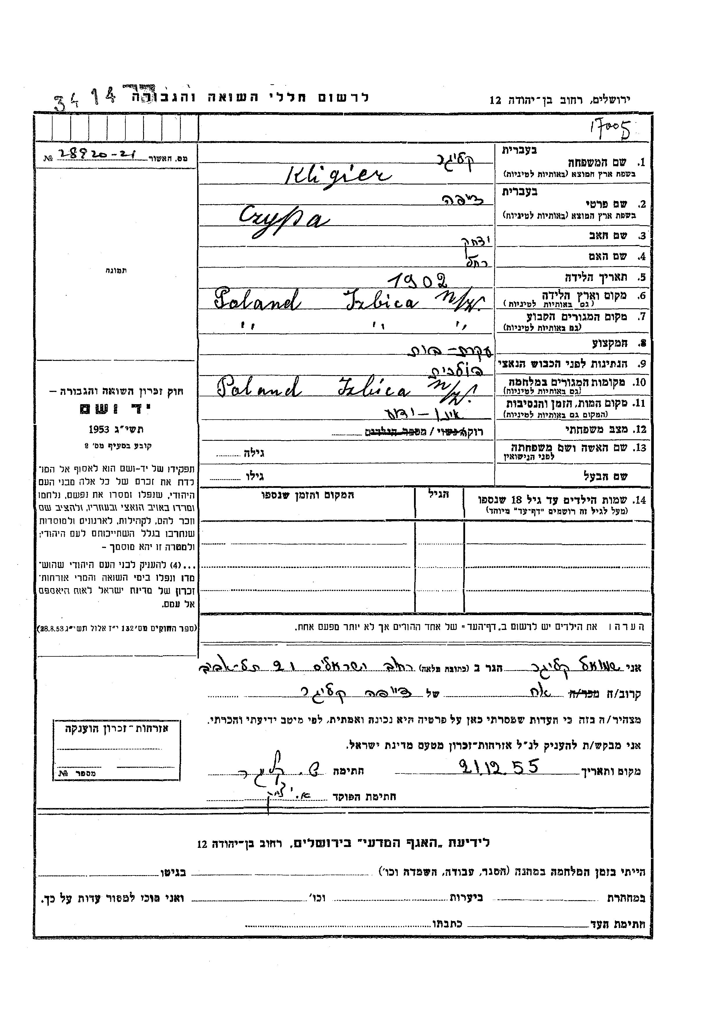 Czypa Kligier wurde im Jahr 1902 in Izbica nad Wieprzem, Polen geboren. Sie war die Tochter von Yitzkhak und Rakhel. Sie war Hausfrau und Ledig. Vor dem Zweiten Weltkrieg lebte sie in Izbica nad Wieprzem, Polen. Während des Krieges war sie in Izbica nad Wieprzem, Polen.