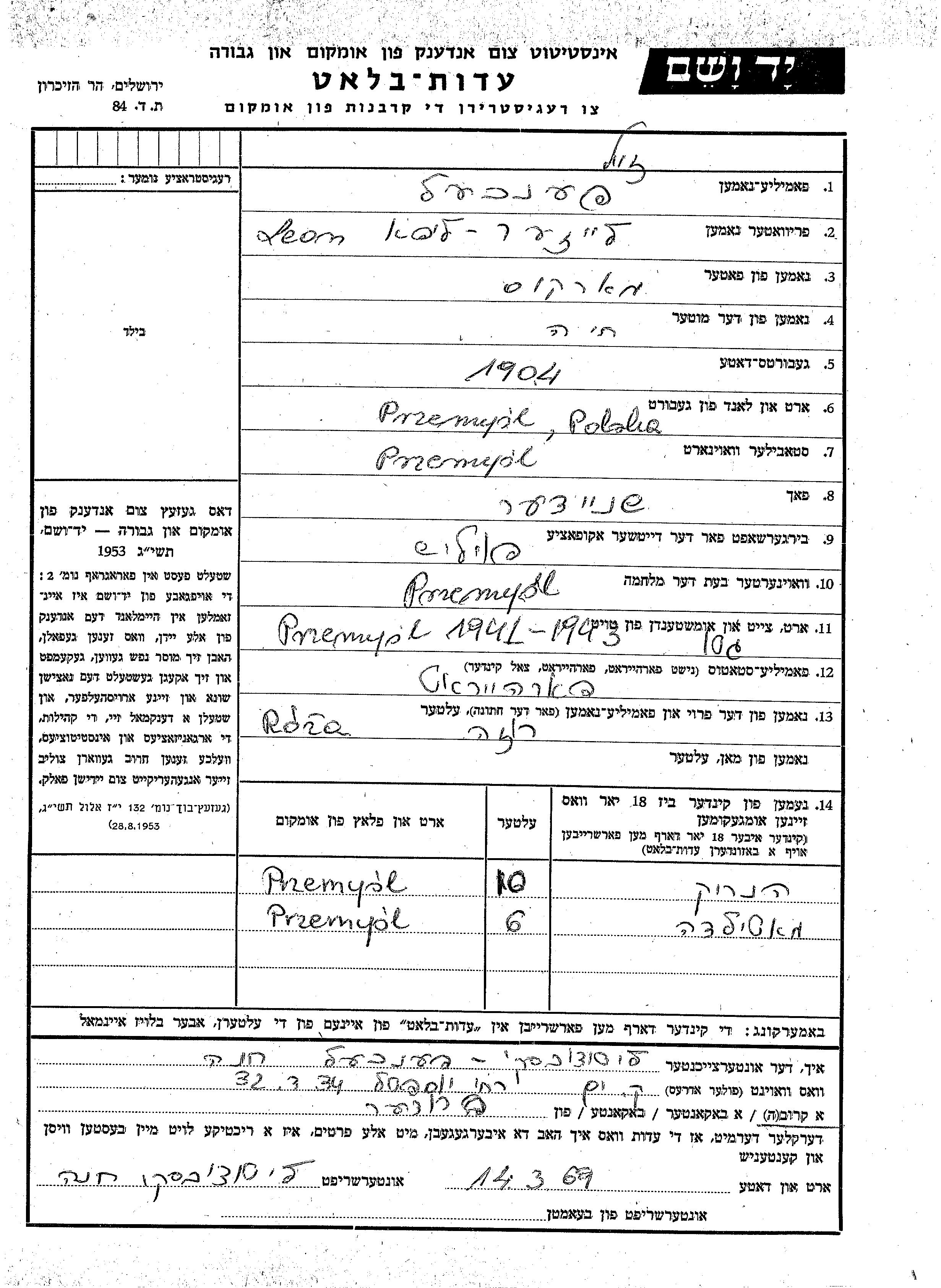 Matilda Fenkhel wurde Sie war die Tochter von Leizer Lipa Leon und Roza. Sie war Kind. Vor dem Zweiten Weltkrieg lebte sie in Przemysl, Polen. Während des Krieges war sie in Przemysl, Polen.