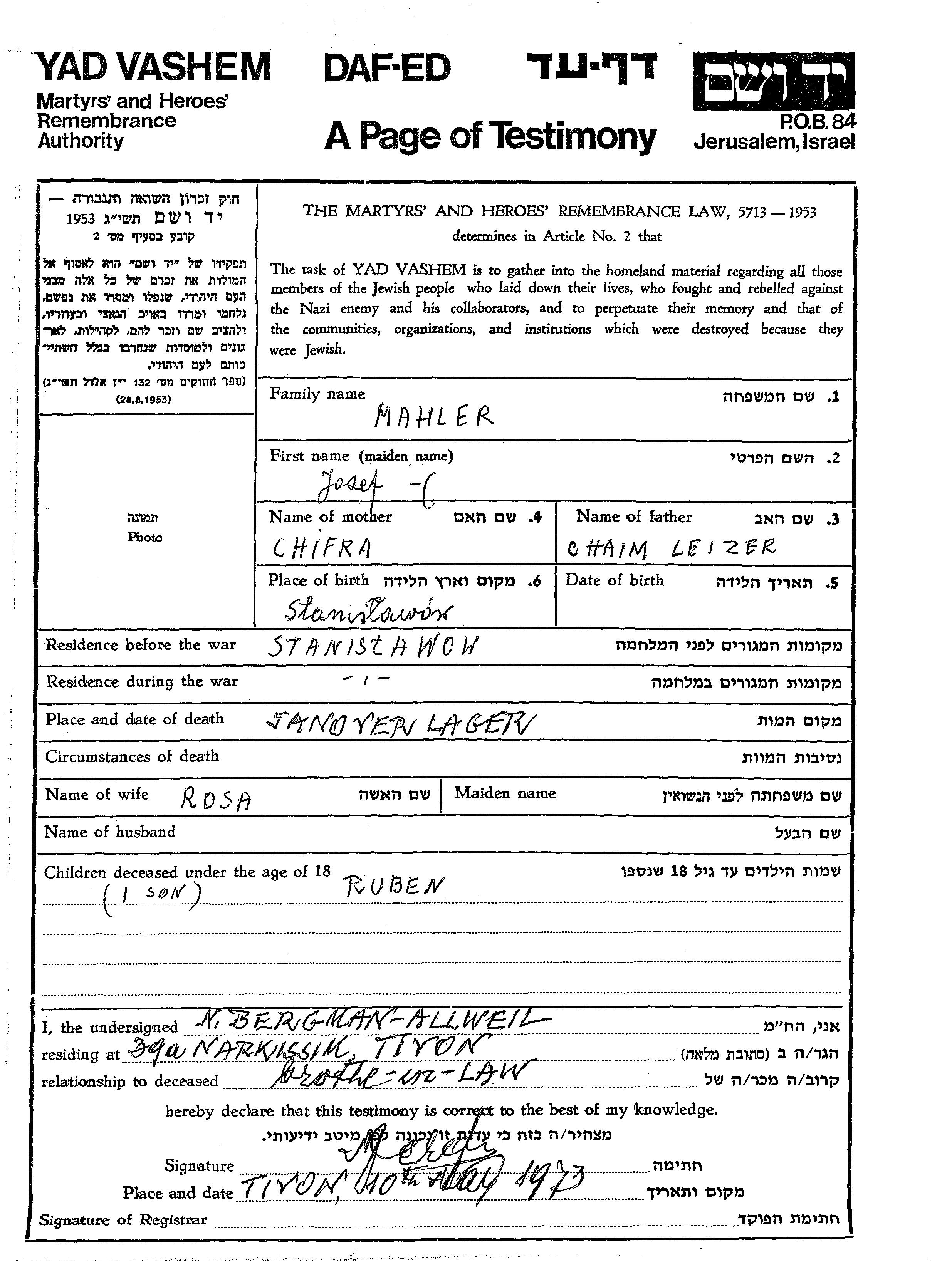 Reuven Mahler wurde Er war der Sohn von Josef und Rosa. Er war Kind. Vor dem Zweiten Weltkrieg lebte er in Stanislawow, Polen. Während des Krieges war er in Stanislawow, Polen.
