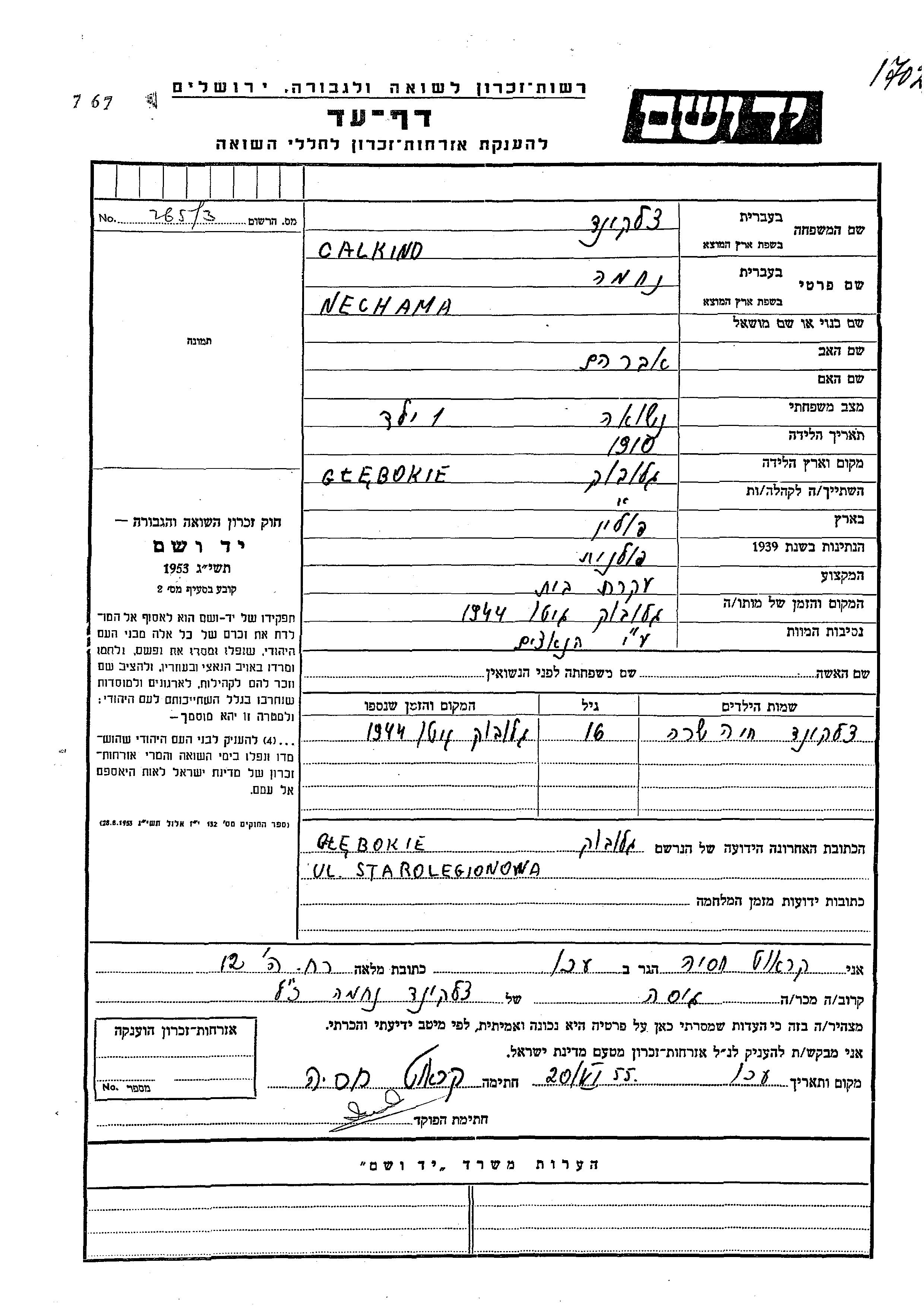Calkind Khaia Sara Glebokie, Polen Gedenkblatt
