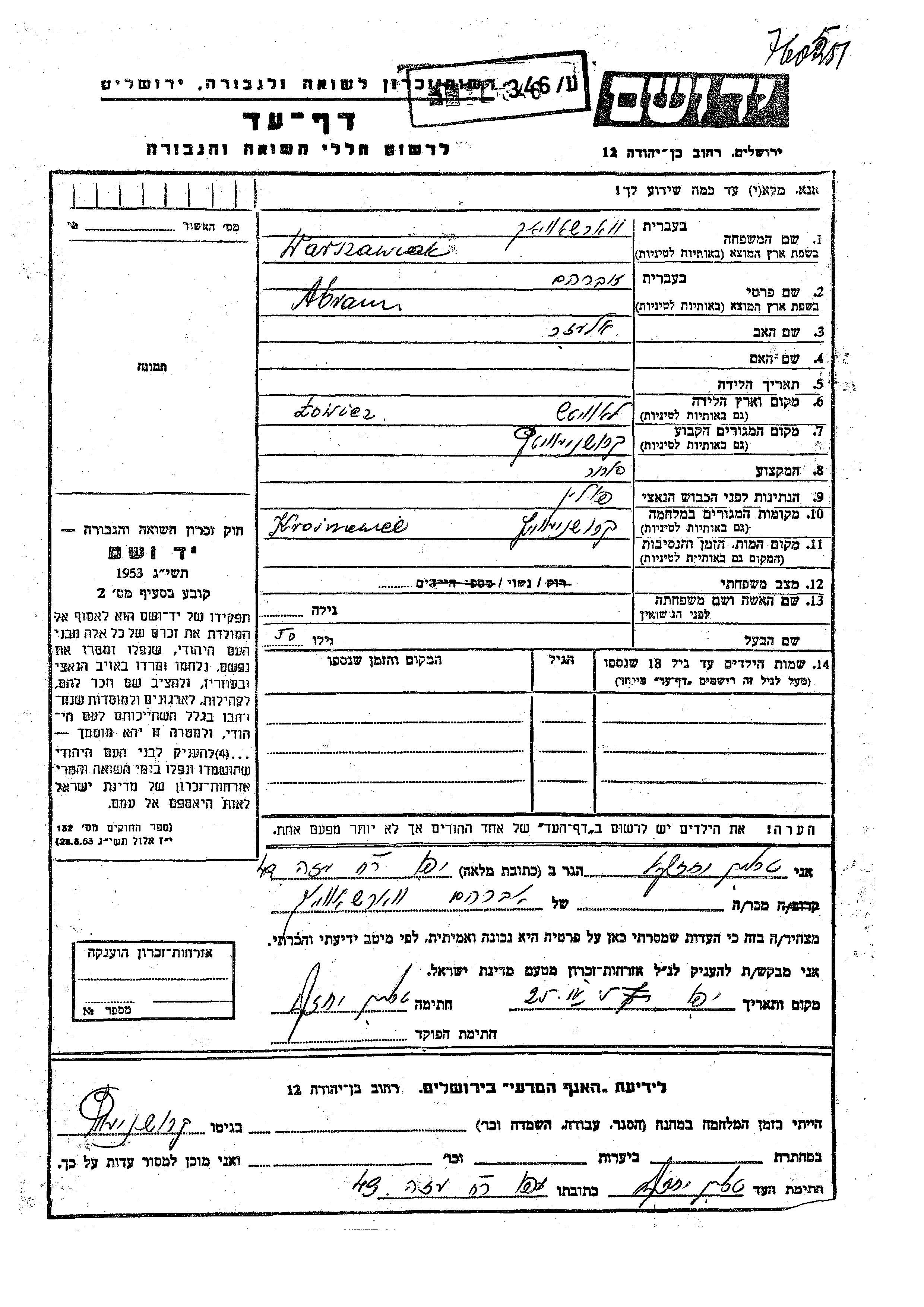 Abram Warszawiak wurde in Lowicz, Polen geboren. Er war der Sohn von Elazar. Er war Kaufmann/-frau und Verheiratet. Vor dem Zweiten Weltkrieg lebte er in Krosniewice, Polen. Während des Krieges war er in Krosniewice, Polen.