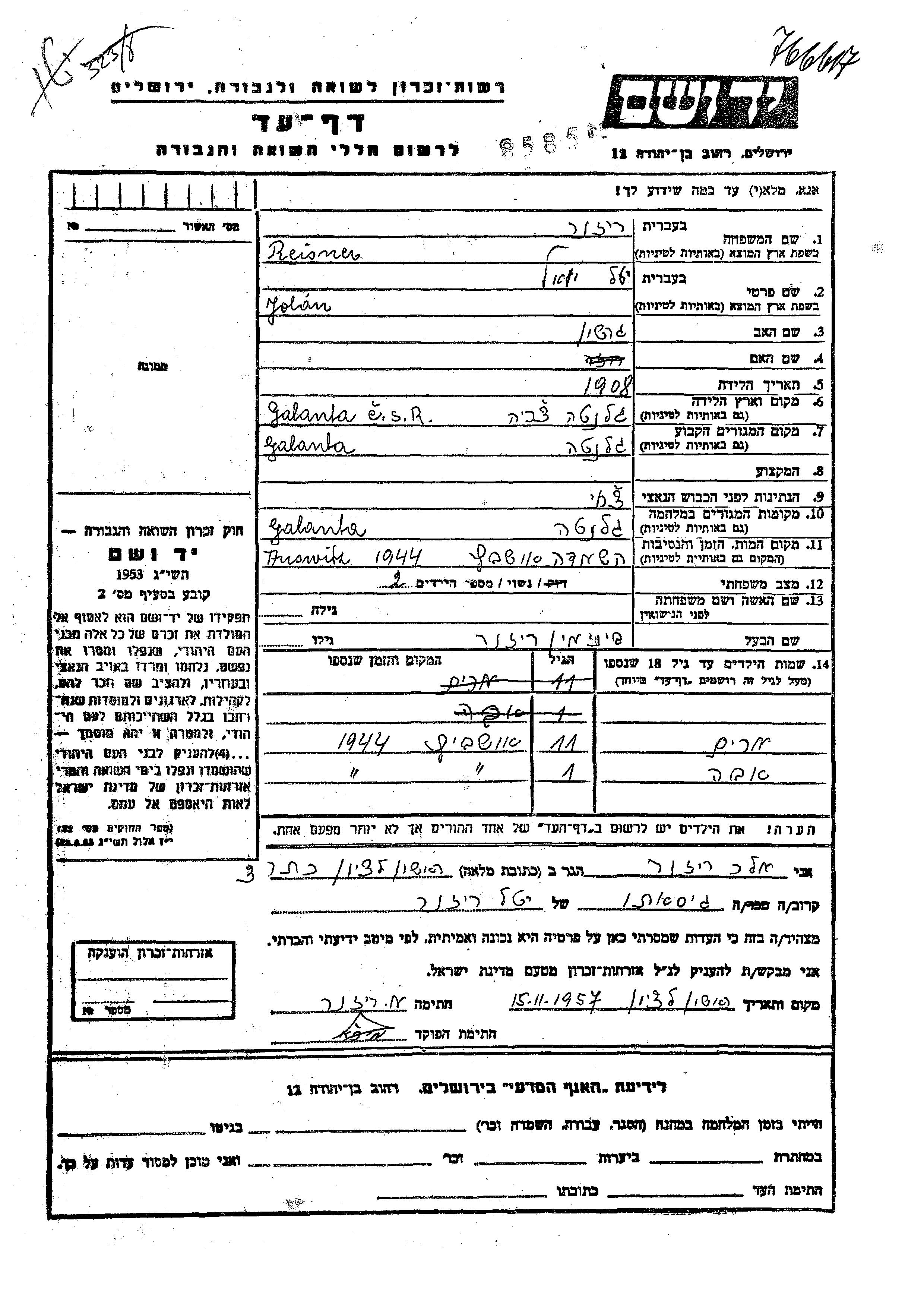 Aba Reisner Rizner wurde Er/sie war der/ die Sohn/Tochter von Biniamin und Jolan Ietel. Er/Sie war Kind. Vor dem Zweiten Weltkrieg er/sie in Galanta, Tschechoslowakei. Während des Krieges war er/sie in Galanta, Tschechoslowakei.