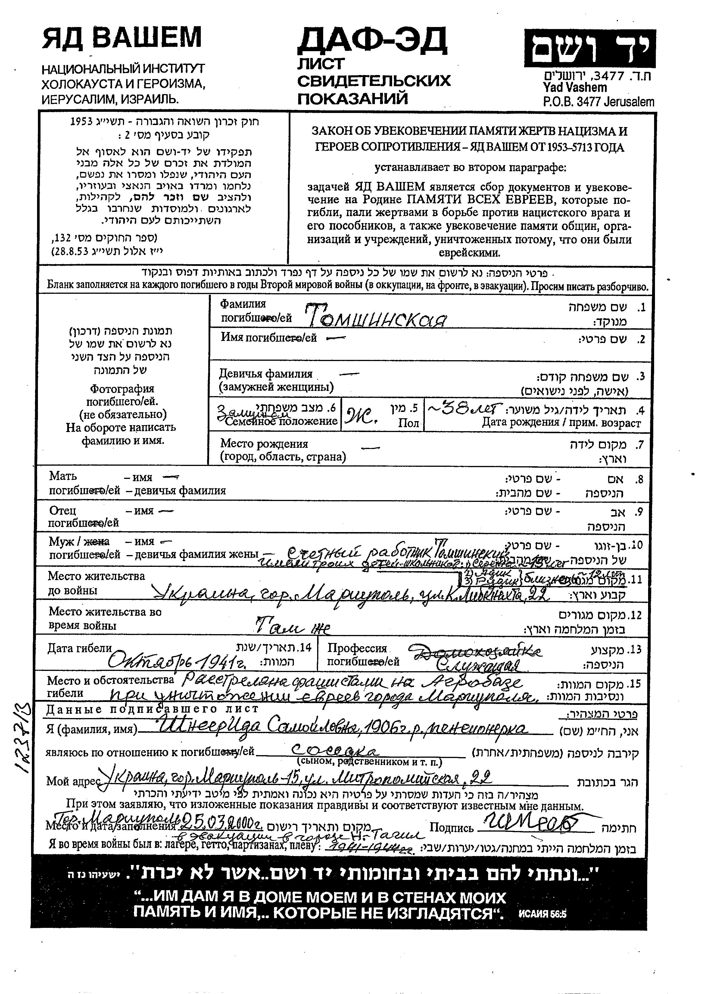 Seryozha Tomshinskaya wurde Er war der Sohn von Vorname unbekannt. Er war Kind. Vor dem Zweiten Weltkrieg lebte er in Mariupol, Ukraine (UdSSR). Während des Krieges war er in Mariupol, Ukraine (UdSSR).