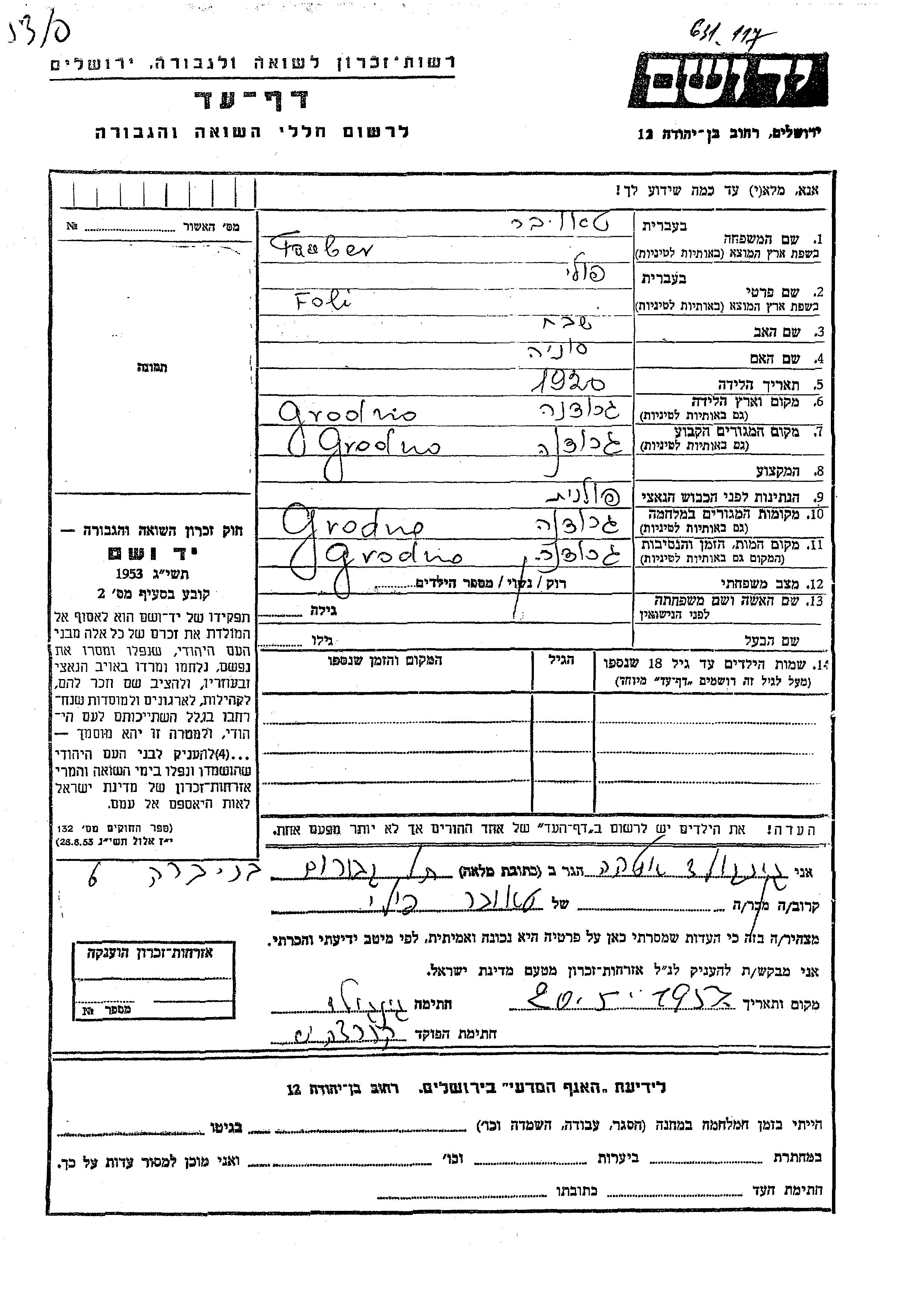 Foli wurde in der Schoah ermordet. Todesort: Grodno, Polen.