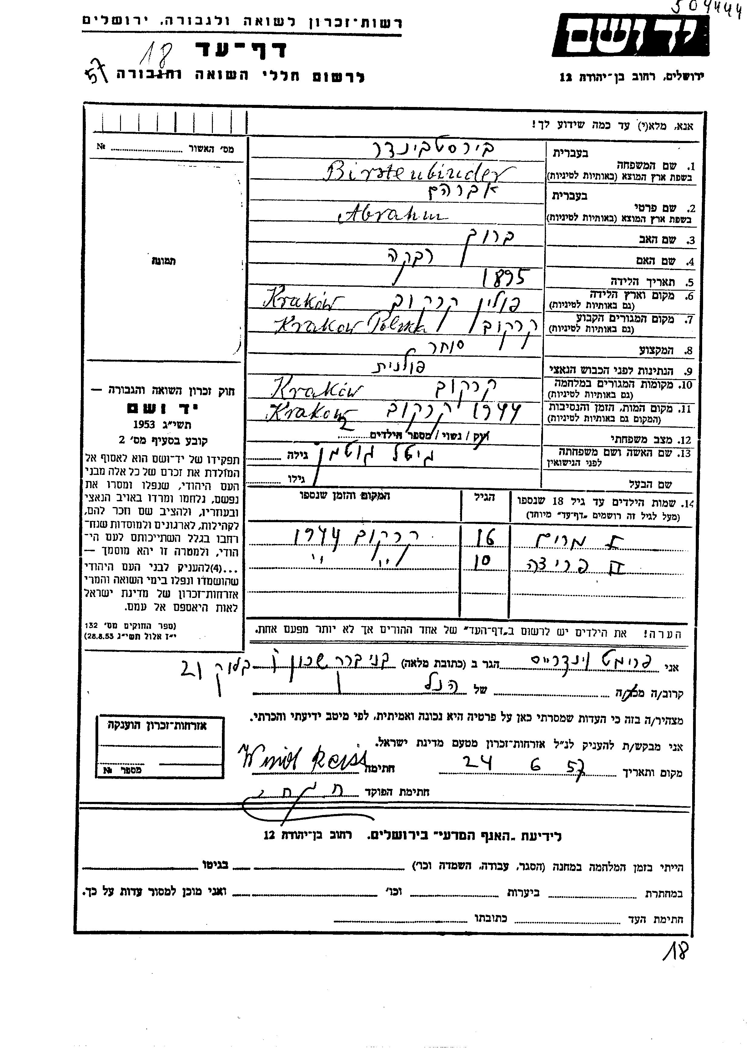 Frida Birstenbinder wurde Sie war die Tochter von Avraham und Matilda, geb. Gotman. Sie war Kind. Vor dem Zweiten Weltkrieg lebte sie in Krakow, Polen. Während des Krieges war sie in Krakow, Polen.