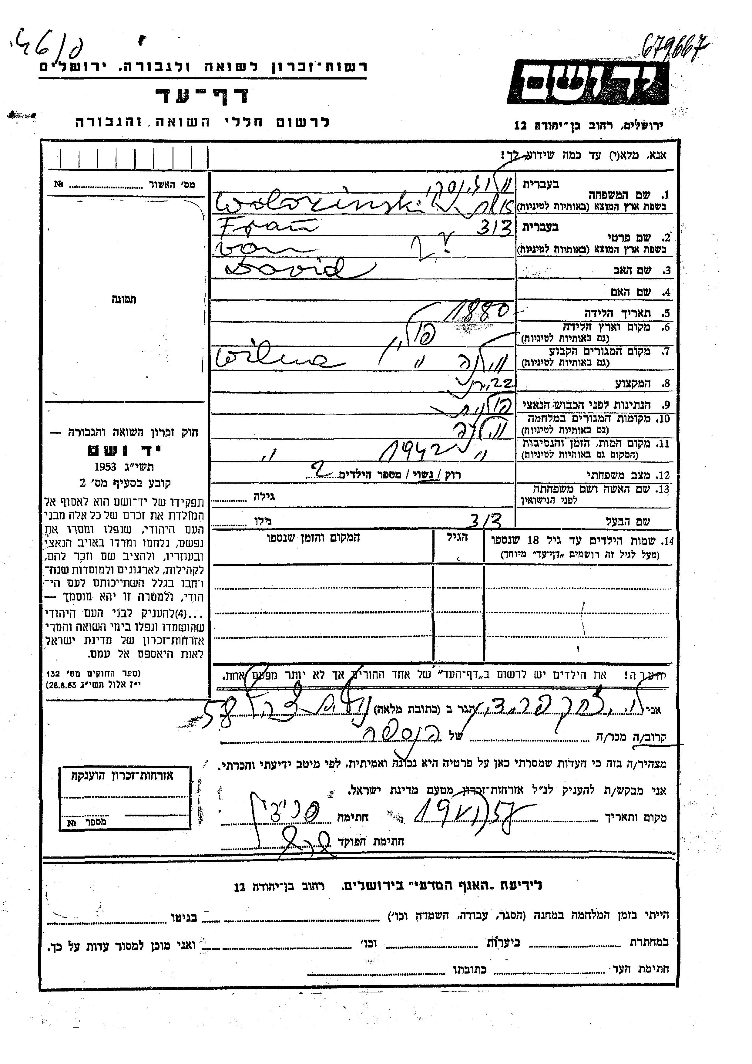 Vorname unbekannt Wolozinski wurde im Jahr 1880 in Polen geboren. Sie war Hausfrau und mit David Verheiratet. Vor dem Zweiten Weltkrieg lebte sie in Wilno, Polen. Während des Krieges war sie in Wilno, Polen.
