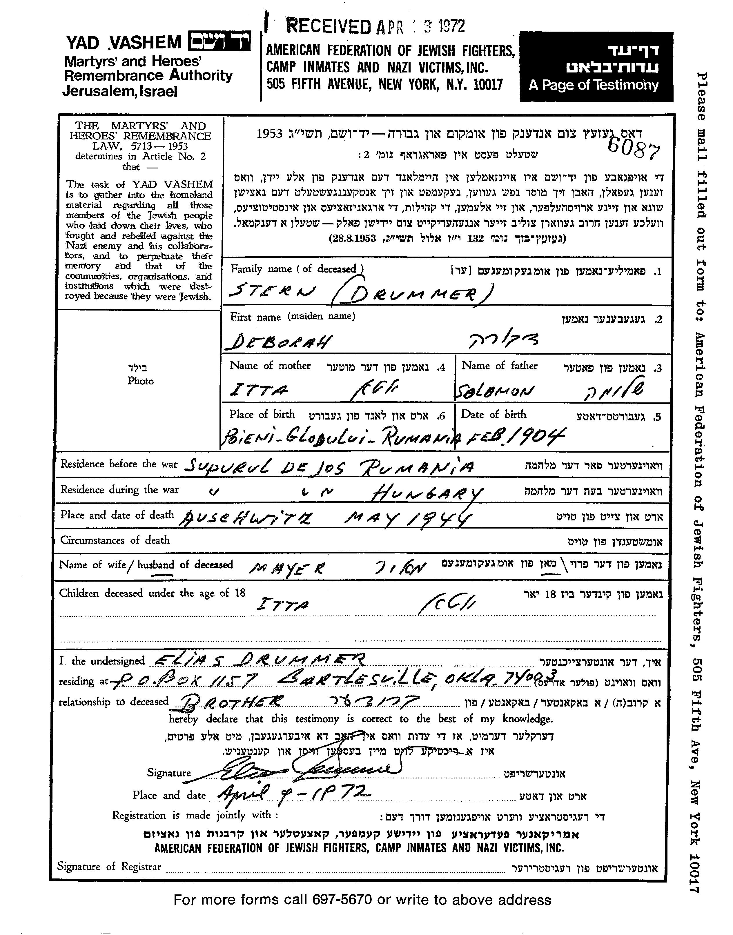 Itta Stern Drummer wurde Sie war die Tochter von Mayer und Deborah. Sie war Kind. Vor dem Zweiten Weltkrieg lebte sie in Supurul de Jos, Rumänien. Während des Krieges war sie in Supurul de Jos, Rumänien.