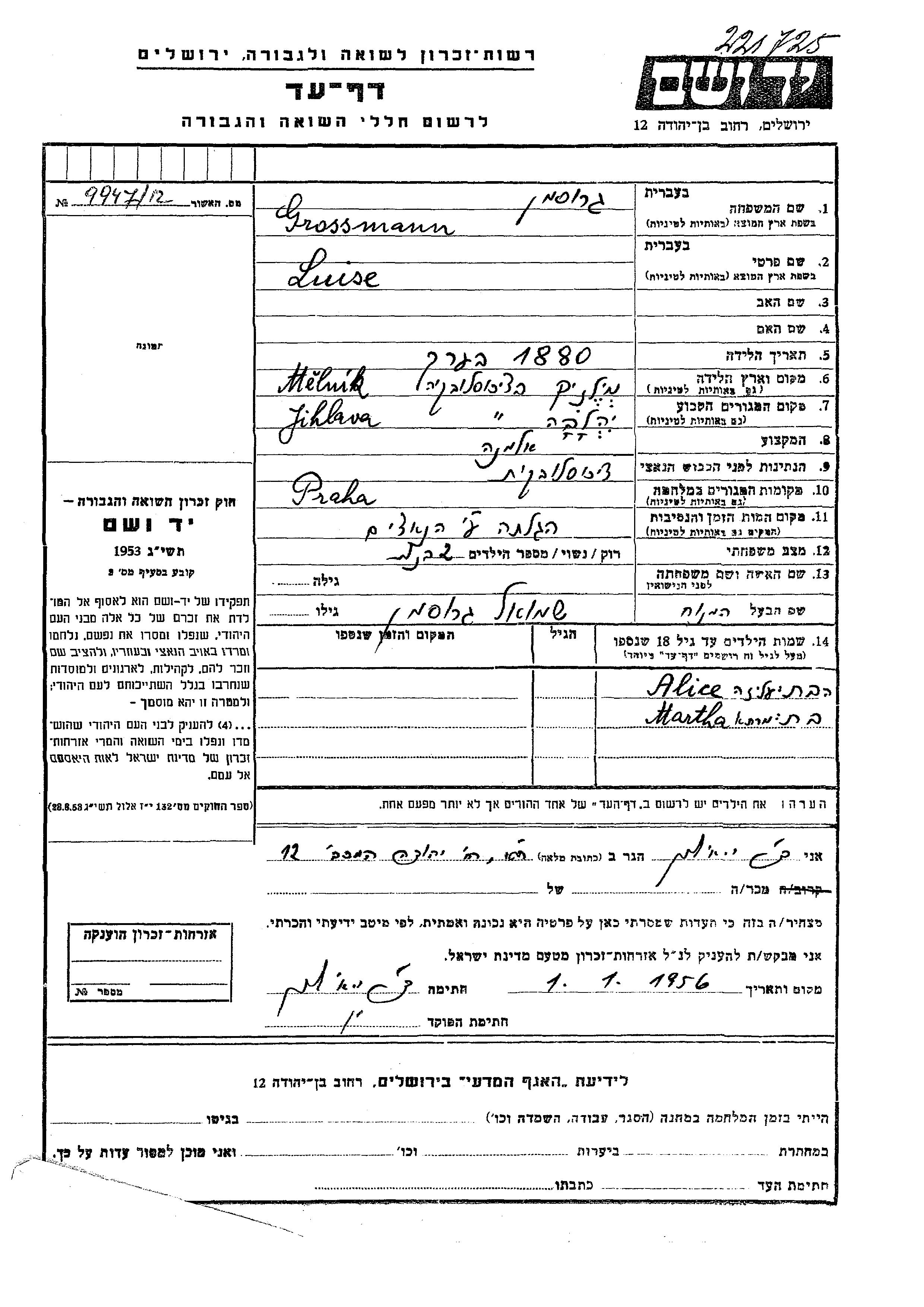 Marta Grossmann wurde Sie war die Tochter von Shmuel und Luise. Sie war Kind. Vor dem Zweiten Weltkrieg lebte sie in Jihlava, Tschechoslowakei. Während des Krieges war sie in Praha, Tschechoslowakei.