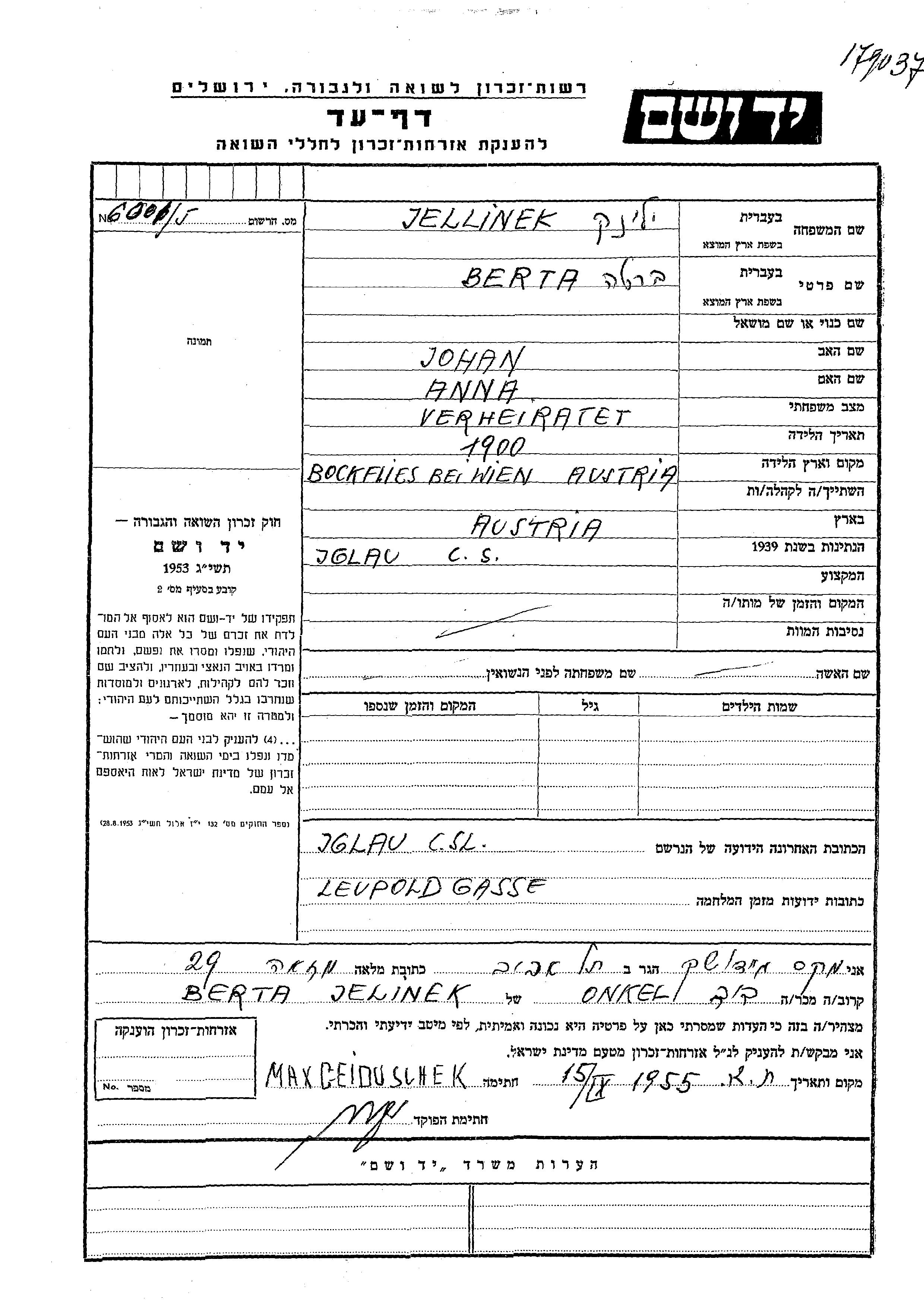 Berta Jellinek wurde im Jahr 1900 in Wien, Österreich geboren. Sie war die Tochter von Johan und Anna. Sie war Verheiratet. Vor dem Zweiten Weltkrieg lebte sie in Österreich. Während des Krieges war sie in Iglau, Tschechoslowakei.