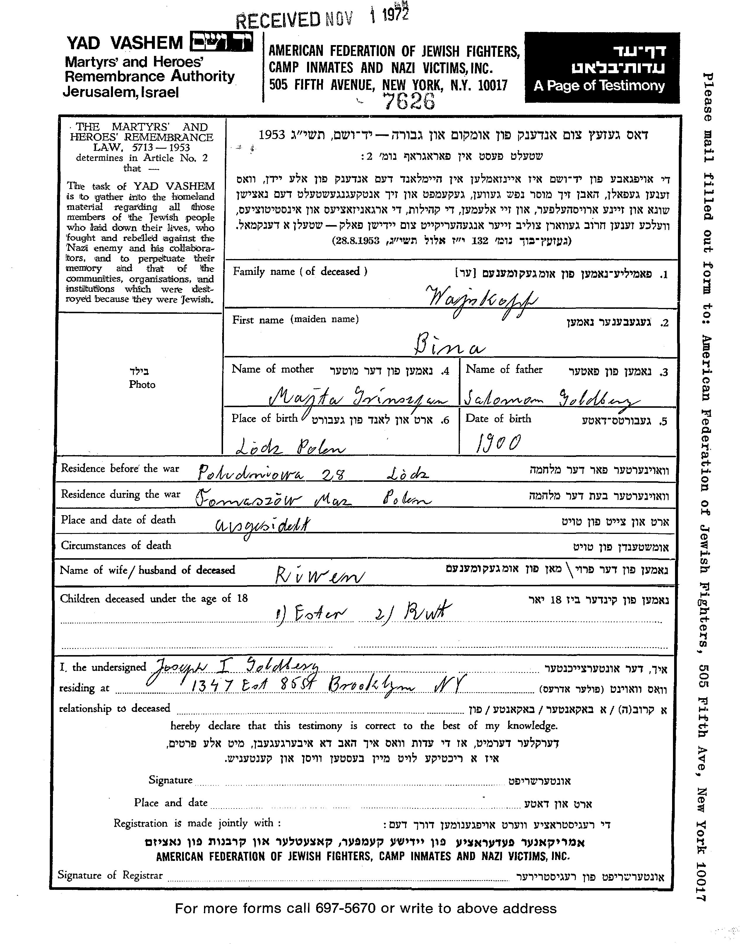 Rut Wajnkopf wurde Er/sie war der/ die Sohn/Tochter von Riwen und Bina, geb. Goldberg. Er/Sie war Kind. Vor dem Zweiten Weltkrieg er/sie in Lodz, Polen. Während des Krieges war er/sie in Tomaszow Mazowieckie, Polen.