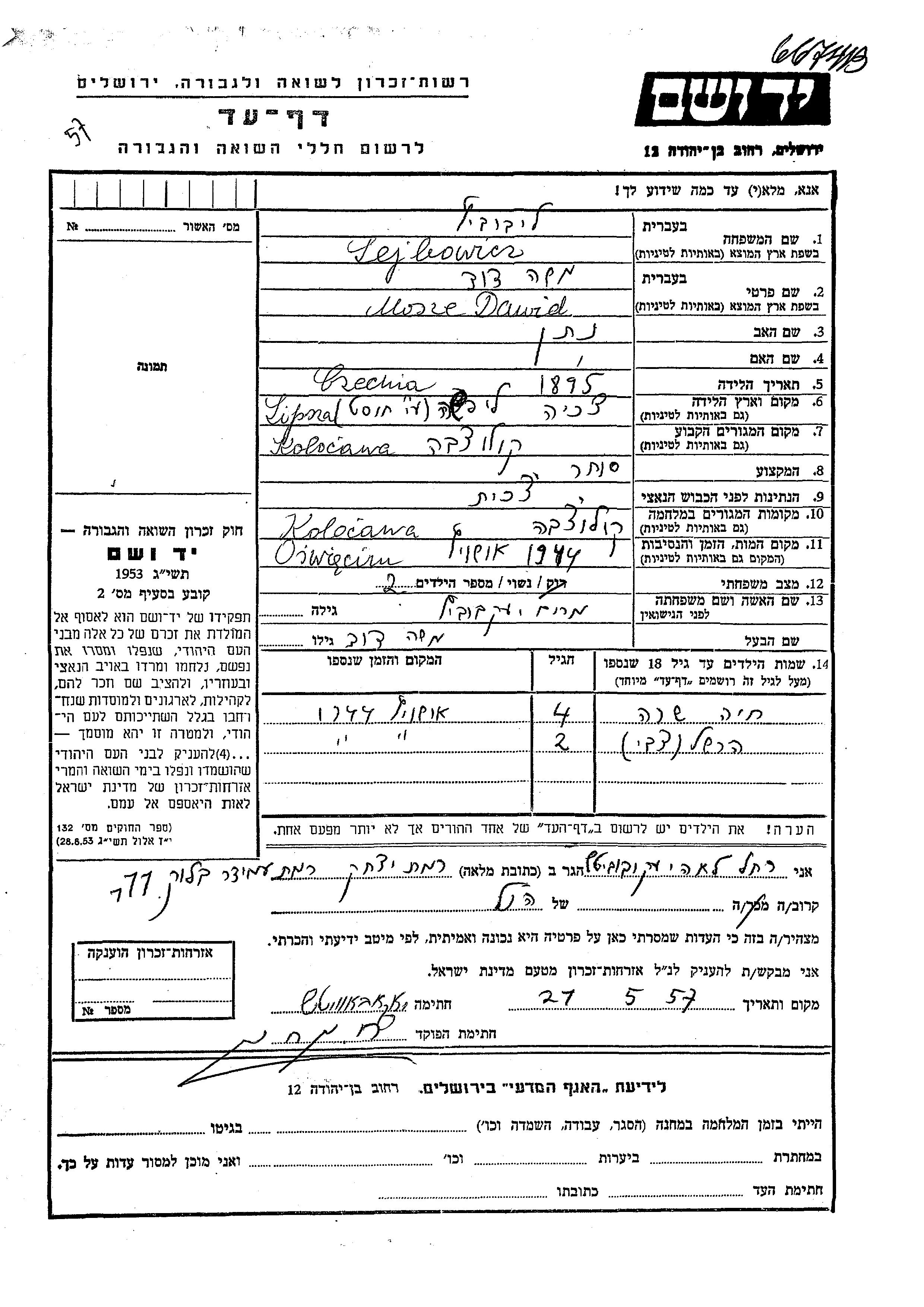 Hershel Tzvi Lejbowicz wurde Er war der Sohn von Mosze Dawid und Miriam, geb. Yakubovitz. Er war Kind. Vor dem Zweiten Weltkrieg lebte er in Kolocava, Tschechoslowakei. Während des Krieges war er in Kolocava, Tschechoslowakei.