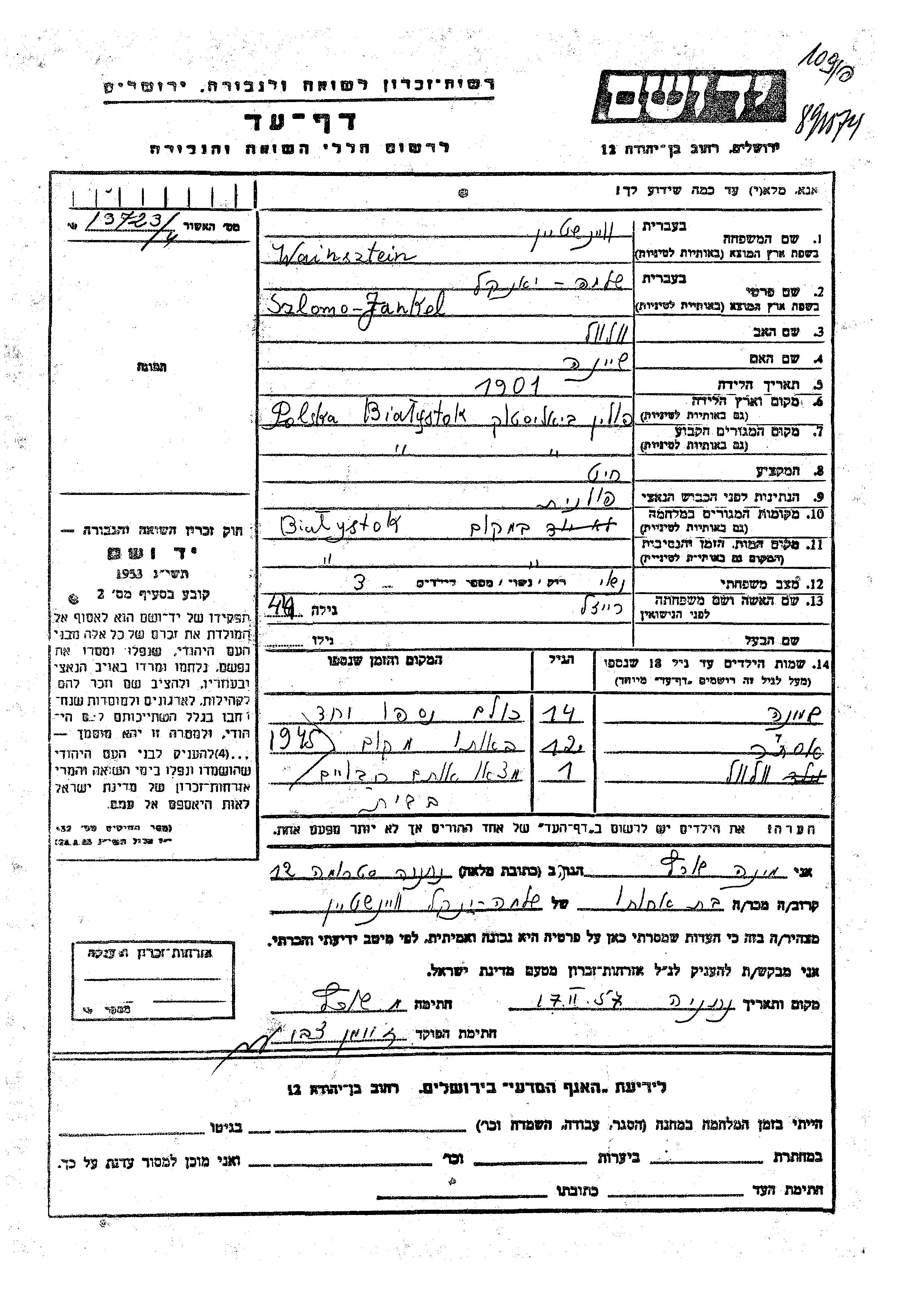Wainsztein Sheina Bialistok, Polen Gedenkblatt
