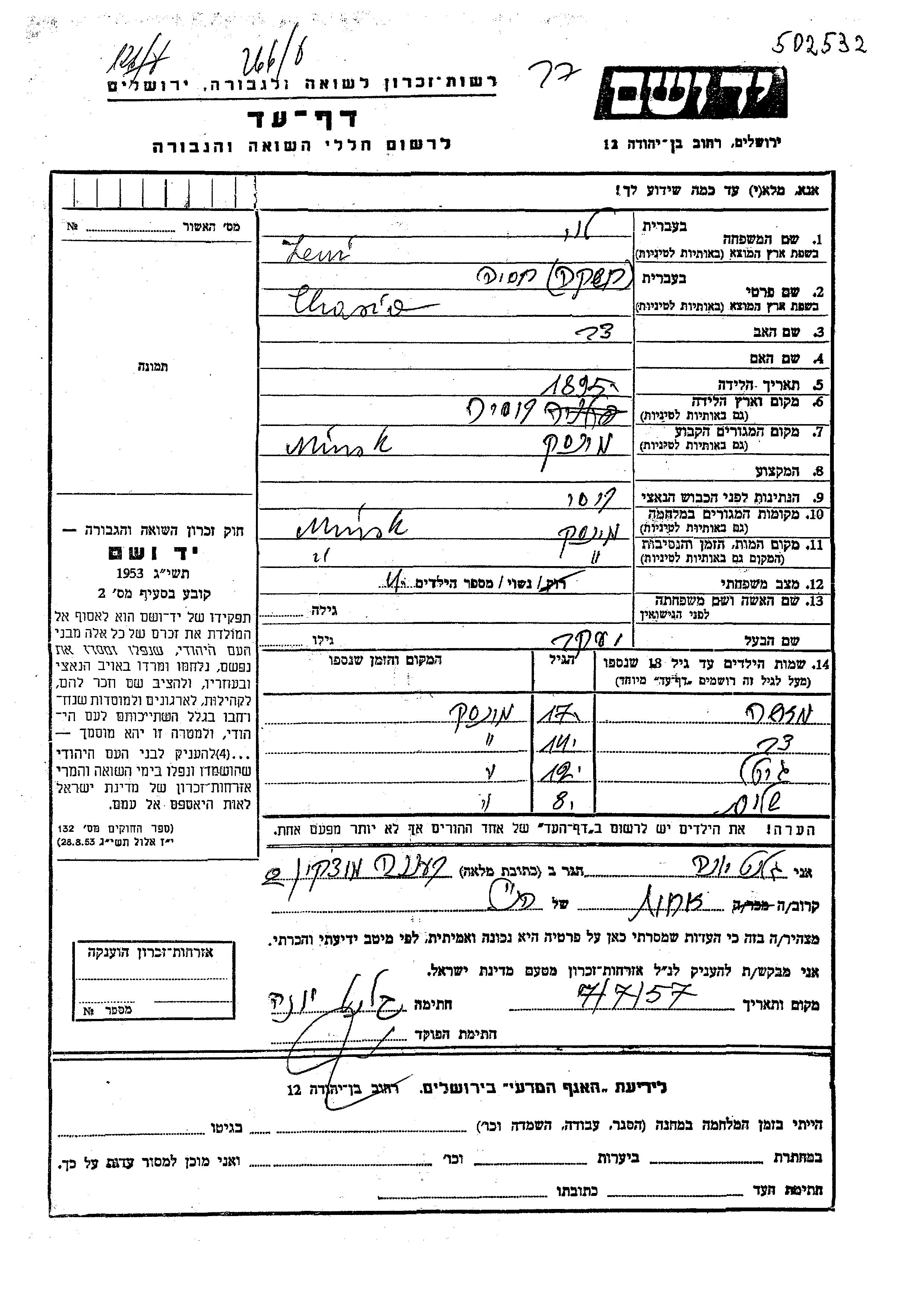 Dov Lewi wurde Er war der Sohn von Yaakov und Chasia. Er war Kind. Vor dem Zweiten Weltkrieg lebte er in Minsk, Weißrussland (UdSSR). Während des Krieges war er in Minsk, Weißrussland (UdSSR).