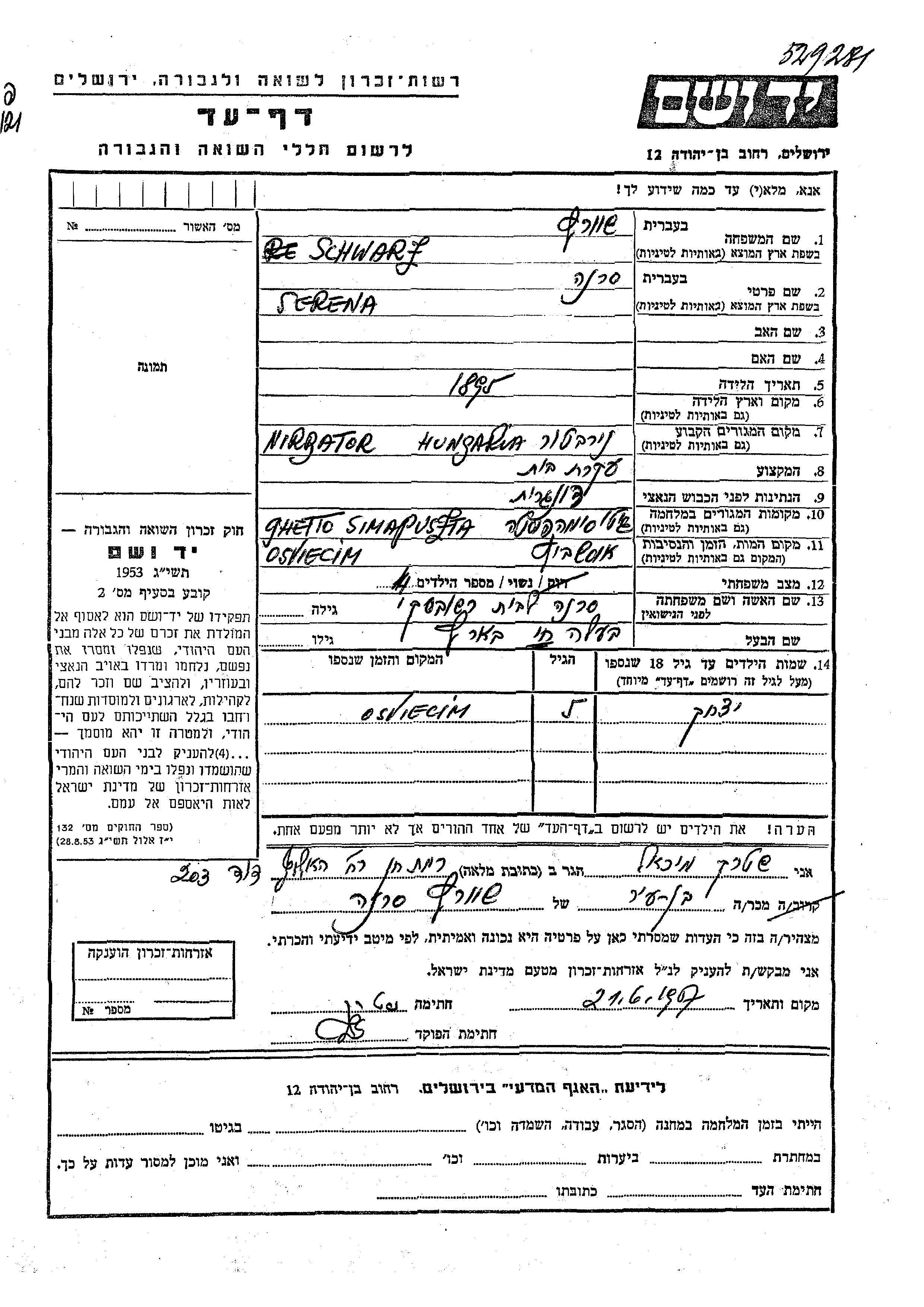 Yitzkhak Schwarz wurde Er war der Sohn von Serena, geb. Rashovski. Er war Kind. Vor dem Zweiten Weltkrieg lebte er in Nirbator, Ungarn. Während des Krieges war er in Simapuszta, Ungarn.