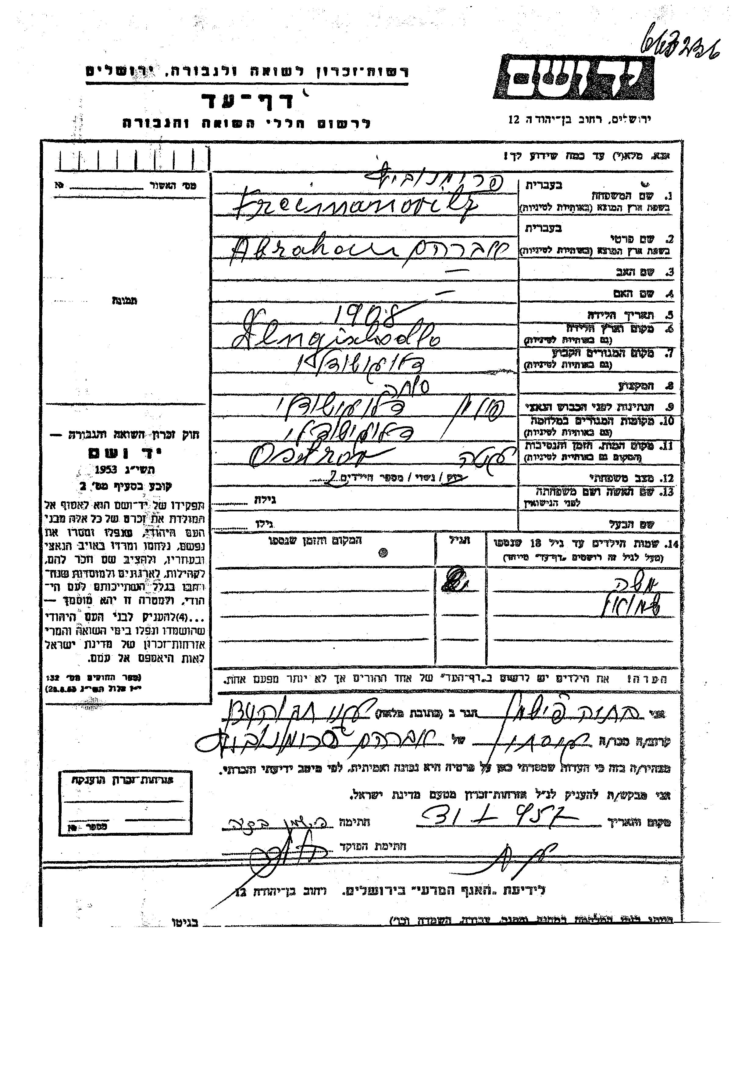 Shmuel Freimanovitz wurde Er war der Sohn von Abraham. Er war Kind. Vor dem Zweiten Weltkrieg lebte er in Dlugasodlo, Polen. Während des Krieges war er in Dlugasodlo, Polen.