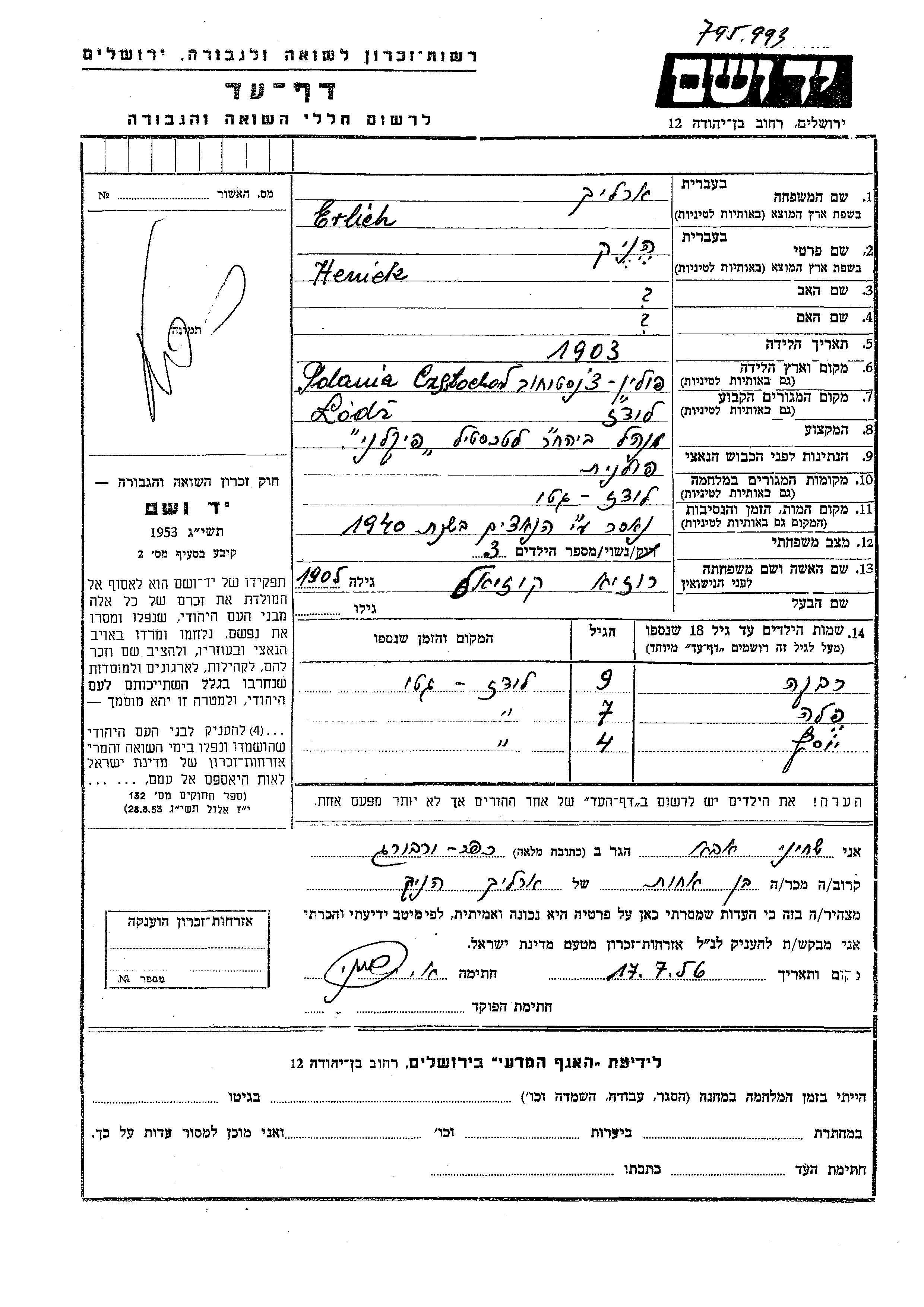 Erlich Fela Lodz, Polen Gedenkblatt