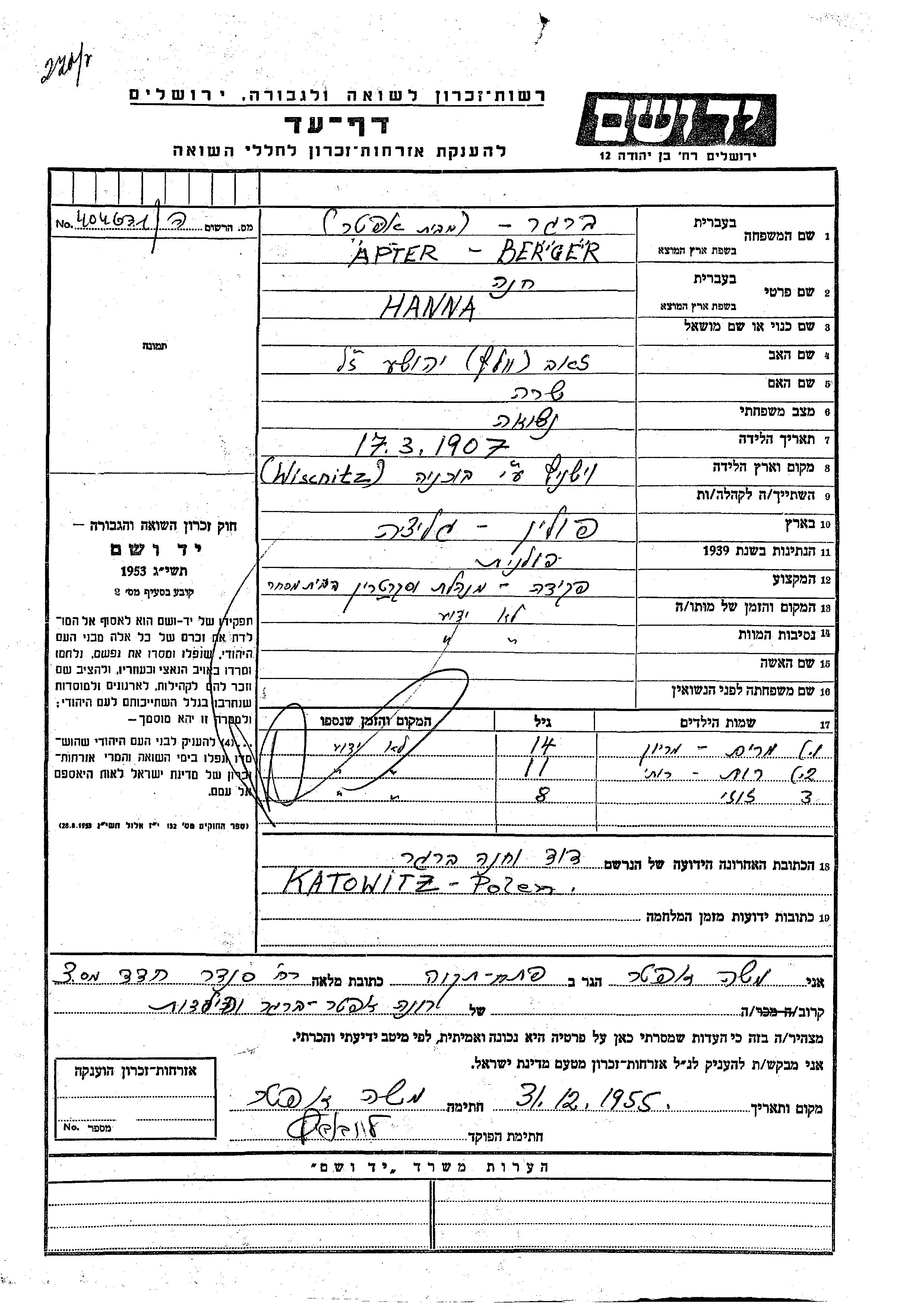 Miriam Marion Berger wurde Sie war die Tochter von David und Hanna, geb. Apter. Sie war Kind. Vor dem Zweiten Weltkrieg lebte sie in Polen. Während des Krieges war sie in Katowice, Polen.