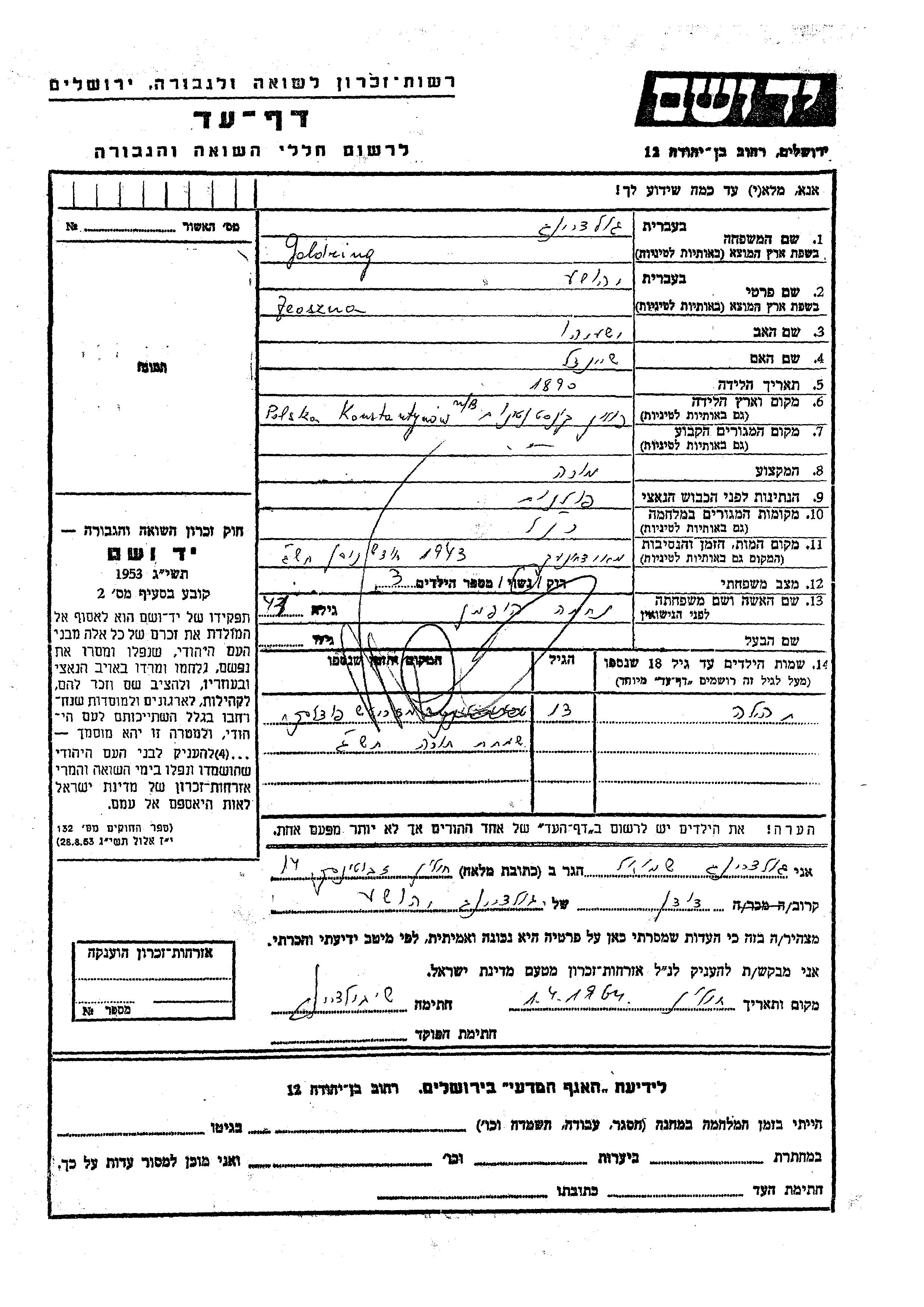 Tehila Goldring wurde Sie war die Tochter von Jeoszua und Nekhama, geb. Hofman. Sie war Kind. Vor dem Zweiten Weltkrieg lebte sie in Konstantynow nad Bugiem, Polen. Während des Krieges war sie in Konstantynow nad Bugiem, Polen.