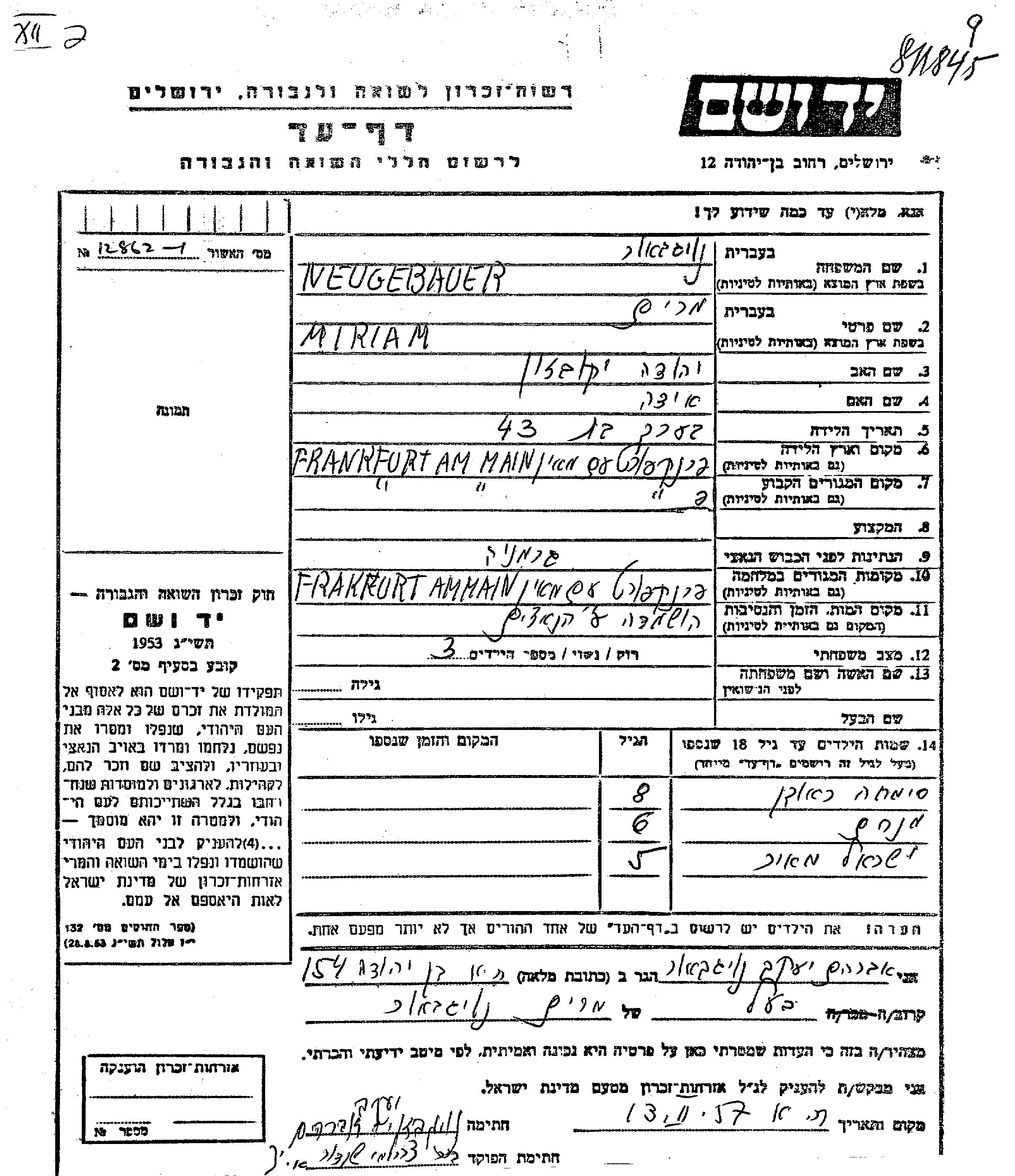Yisrael Meir Neugebauer wurde Er war der Sohn von Miriam, geb. Iakobson. Er war Kind. Vor dem Zweiten Weltkrieg lebte er in Frankfurt, Deutsches Reich. Während des Krieges war er in Frankfurt, Deutsches Reich.