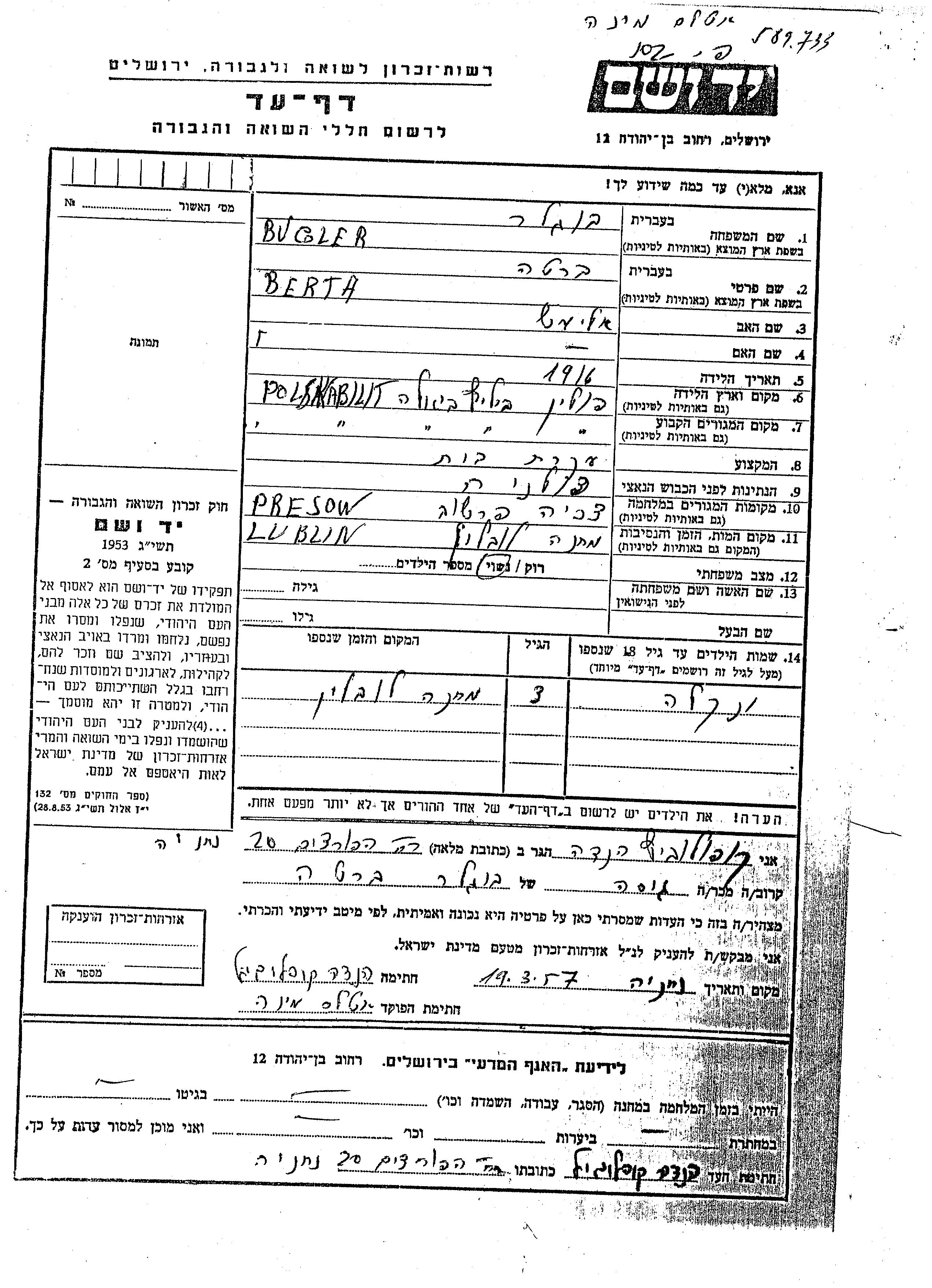 Yaakov Bugler wurde Er war der Sohn von Berta. Er war Kind. Vor dem Zweiten Weltkrieg lebte er in Bielitz Biala, Polen. Während des Krieges war er in Presov, Tschechoslowakei.
