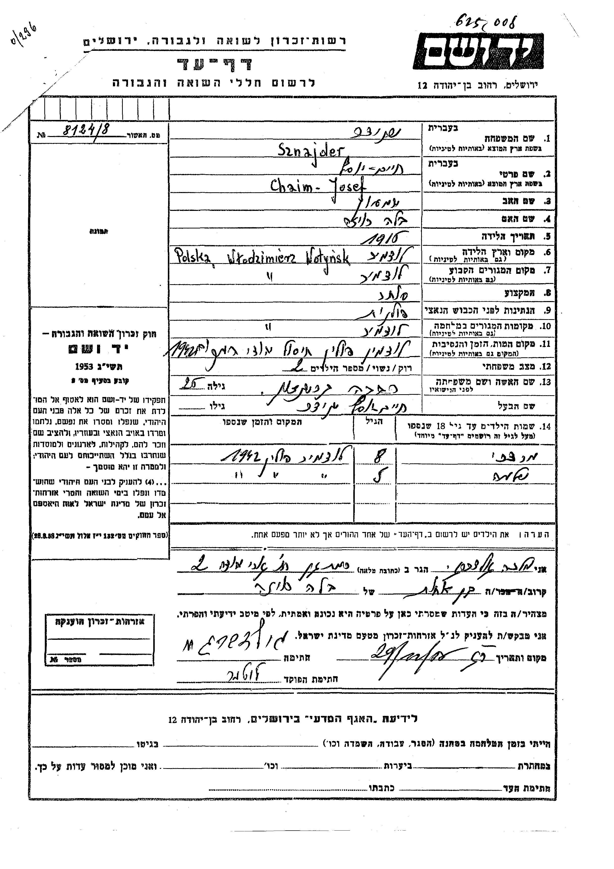 Shlomo Sznajder wurde Er war der Sohn von Chaim Josef und Rivka, geb. Kershenzon. Er war Kind. Vor dem Zweiten Weltkrieg lebte er in Wlodzimierz Wolynski, Polen. Während des Krieges war er in Wlodzimierz Wolynski, Polen.