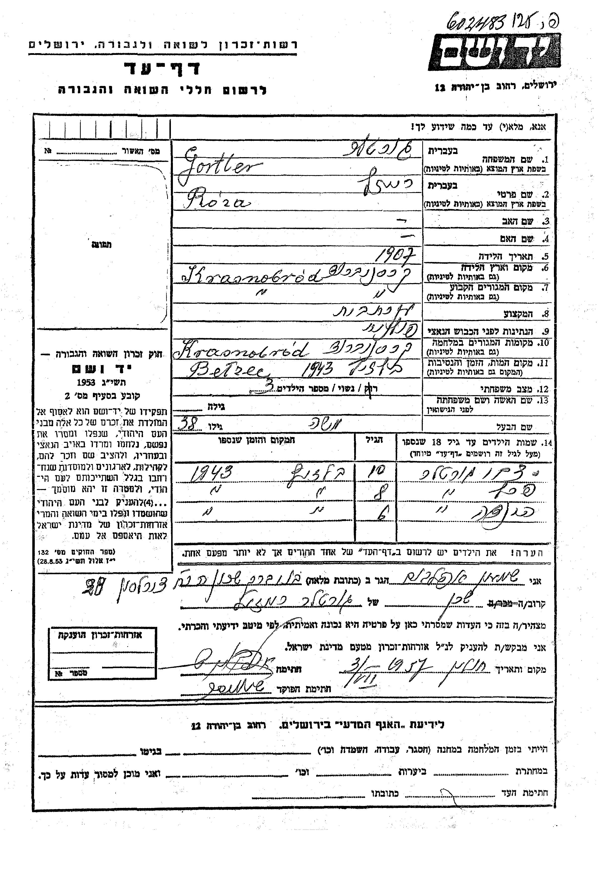 Peretz Gortler wurde Er war der Sohn von Moshe und Reizl. Er war Kind. Vor dem Zweiten Weltkrieg lebte er in Krasnobrod, Polen. Während des Krieges war er in Krasnobrod, Polen.