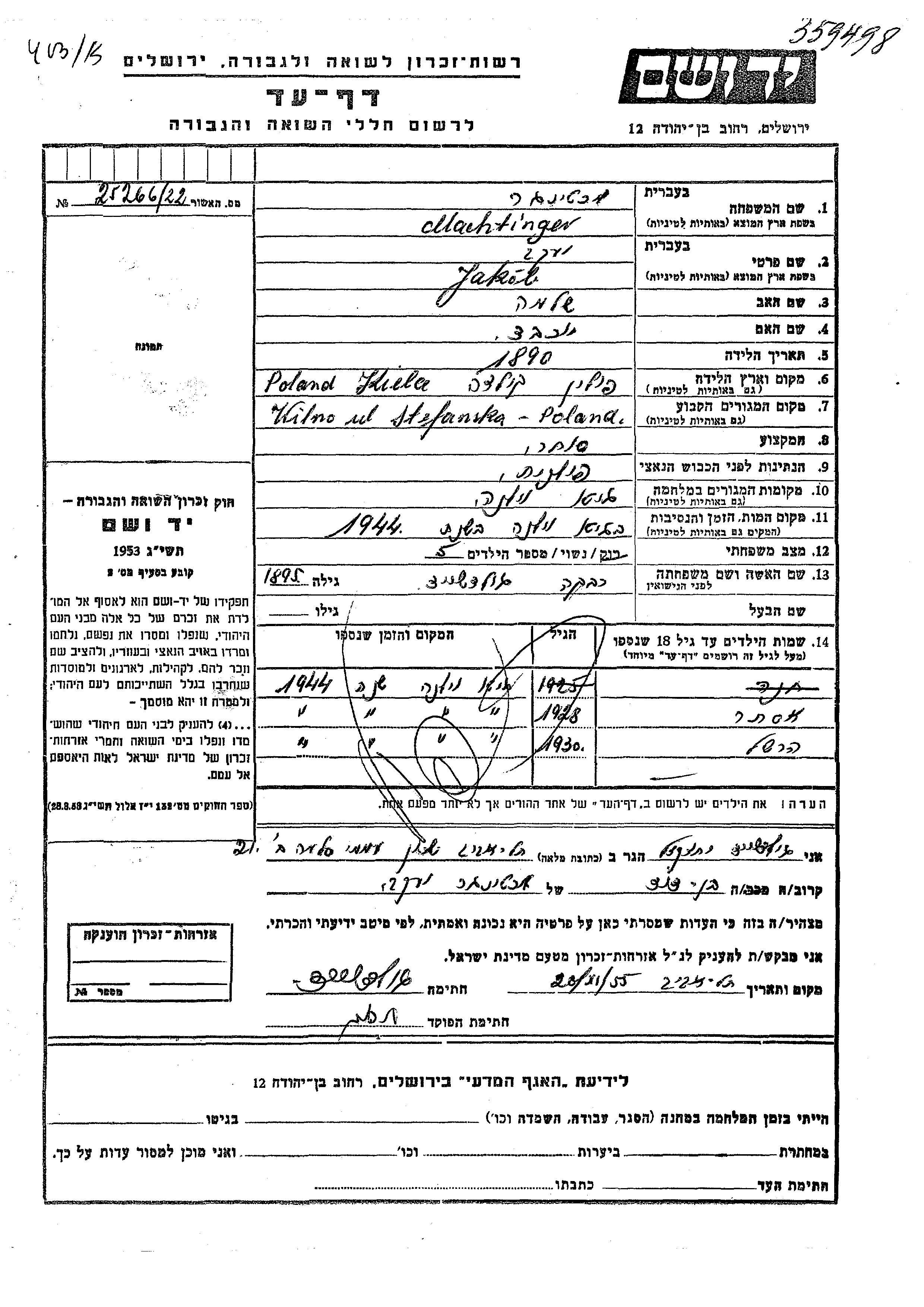 Hershel Machtinger wurde im Jahr 1930 geboren. Er war der Sohn von Jakob und Rivka, geb. Goldsheid. Er war Kind. Vor dem Zweiten Weltkrieg lebte er in Wilno, Polen. Während des Krieges war er in Wilno, Polen.