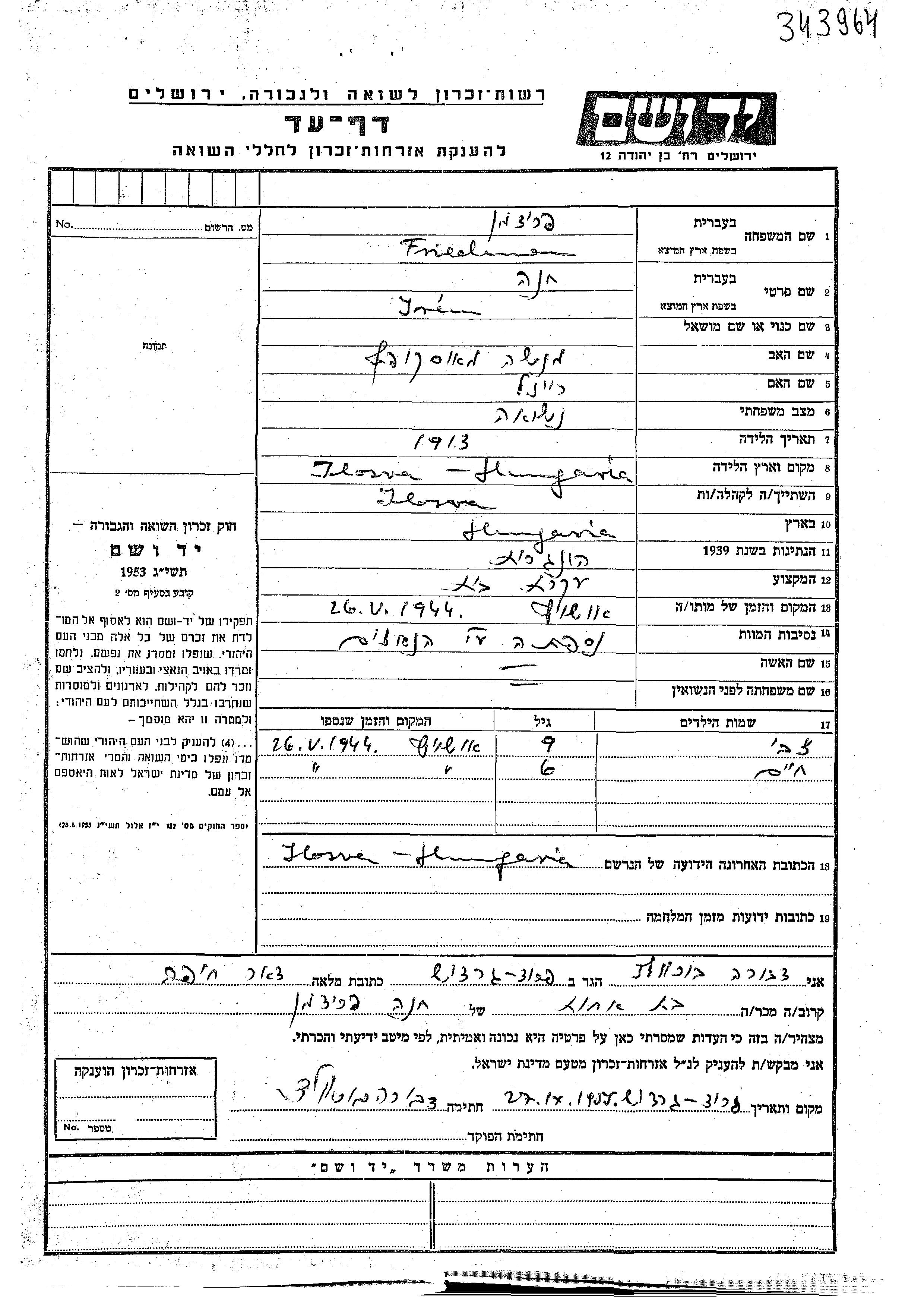 Tzvi Friedman wurde Er/sie war der/ die Sohn/Tochter von Iren Khana, geb. Mausskopf. Er/Sie war Kind. Vor dem Zweiten Weltkrieg er/sie in Ilosva. Während des Krieges war er/sie in Ilosva.
