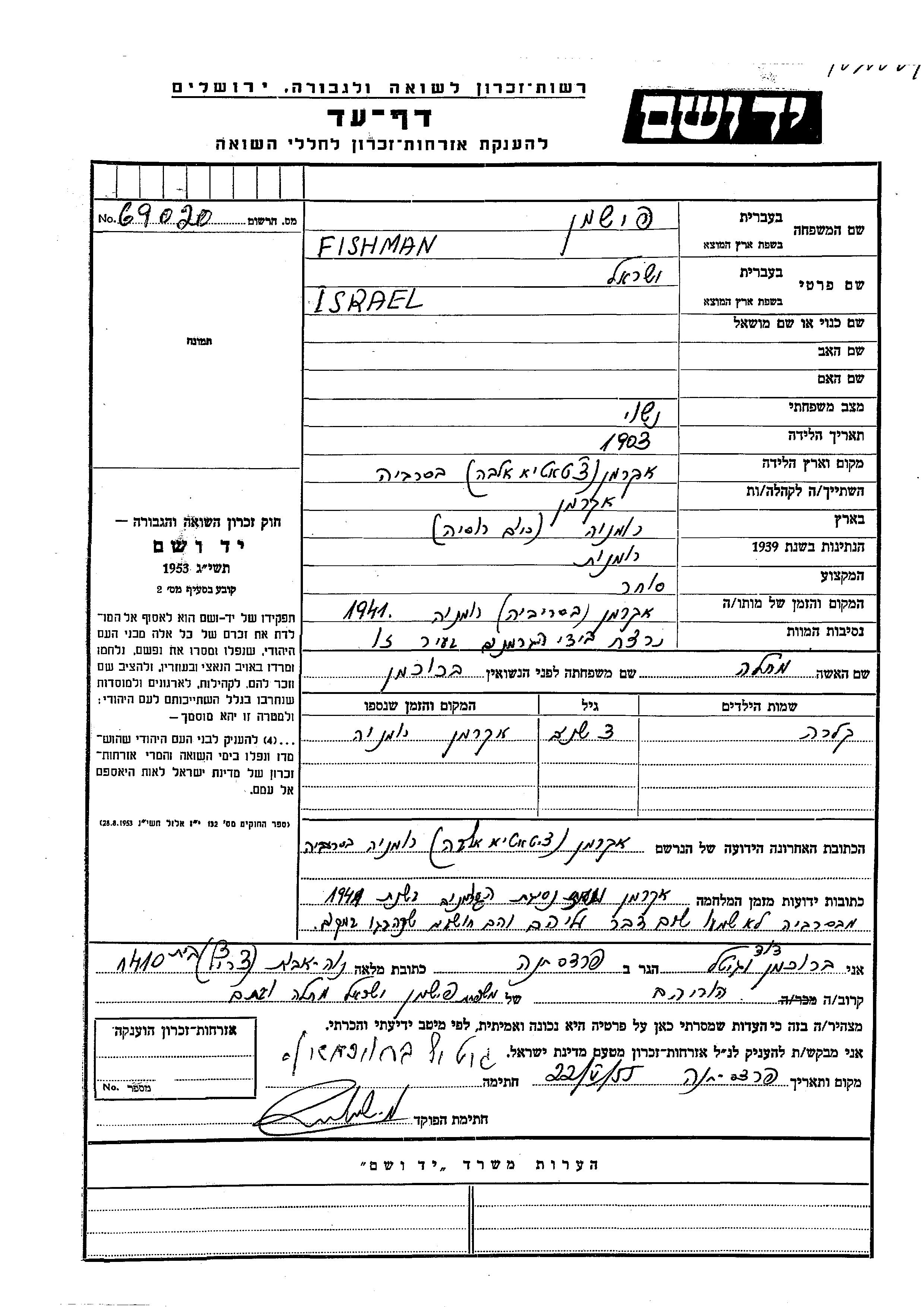 Klara Fishman wurde Sie war die Tochter von Israel und Makhla, geb. Brokhman. Sie war Kind. Vor dem Zweiten Weltkrieg lebte sie in Cetatea Alba, Rumänien. Während des Krieges war sie in Cetatea Alba, Rumänien.
