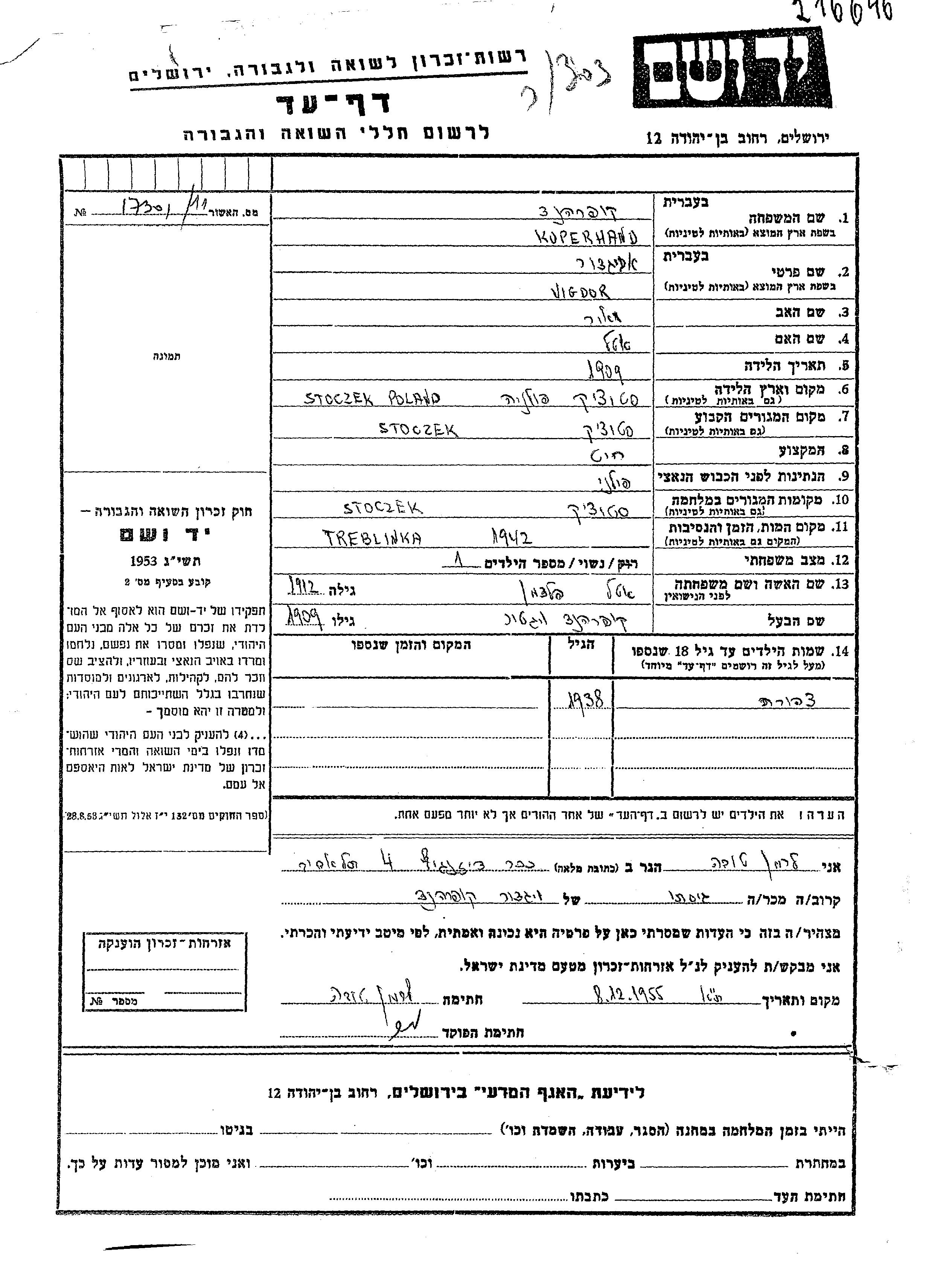 Kuperhand Tzipora 1938 Stoczek, Polen Gedenkblatt