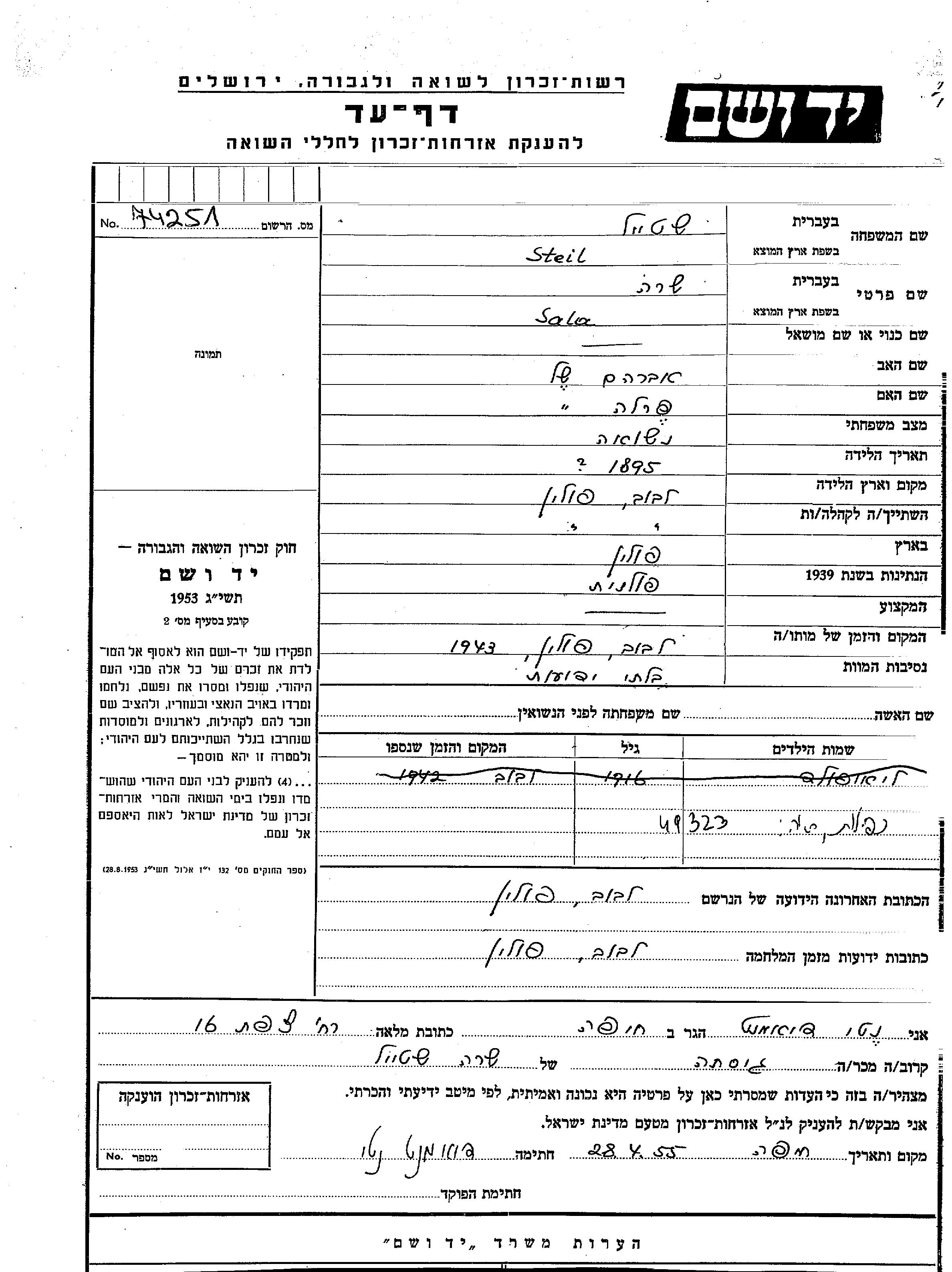Liopold Steil wurde im Jahr 1916 geboren. Er war der Sohn von Sala Sara, geb. Shel. Vor dem Zweiten Weltkrieg lebte er in Lwow, Polen. Während des Krieges war er in Lwow, Polen.