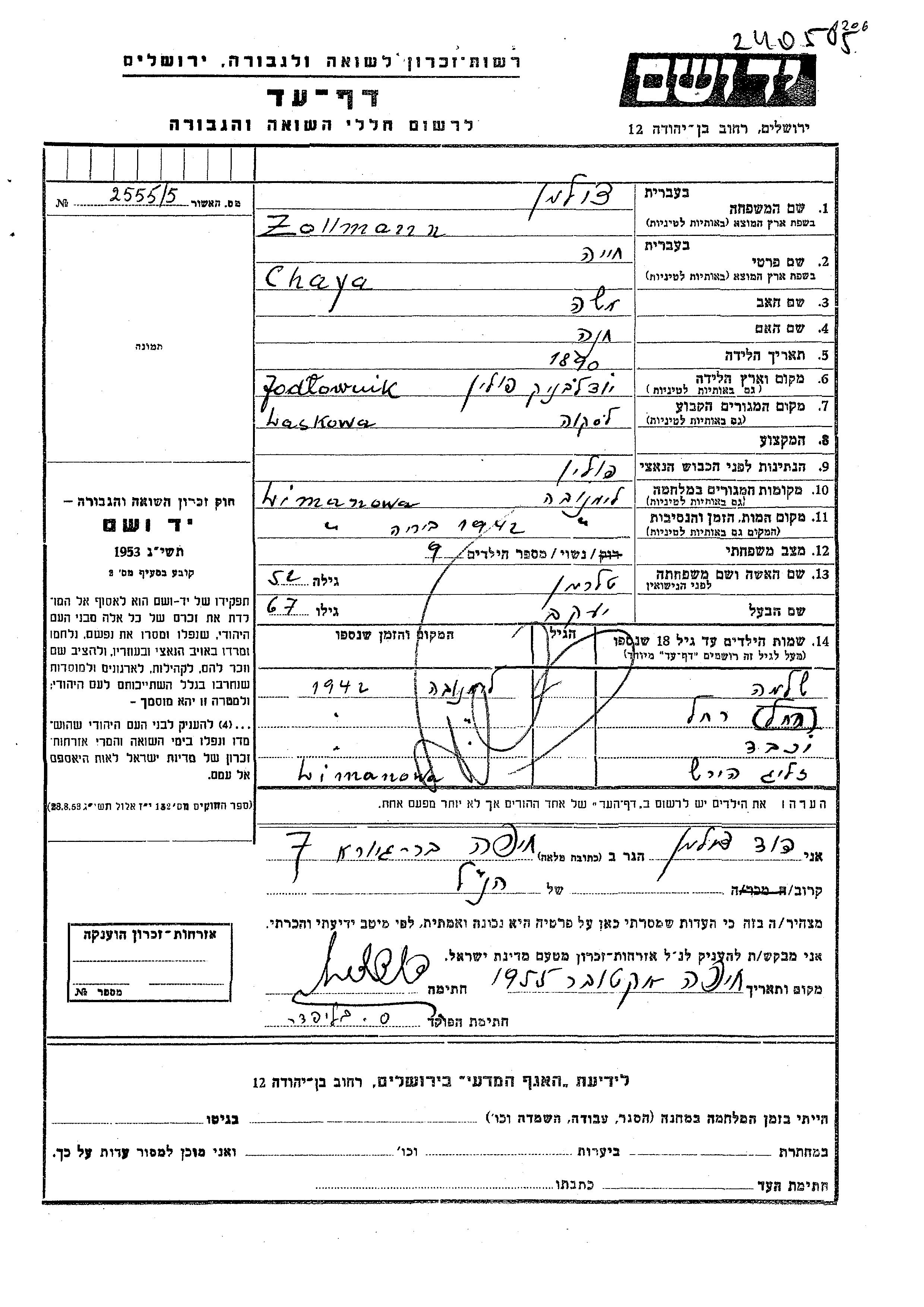 Rakhel Zollmann wurde Sie war die Tochter von Yaakov und Chaya, geb. Telerman. Sie war Kind. Vor dem Zweiten Weltkrieg lebte sie in Laskowa, Polen. Während des Krieges war sie in Limanowa, Polen.